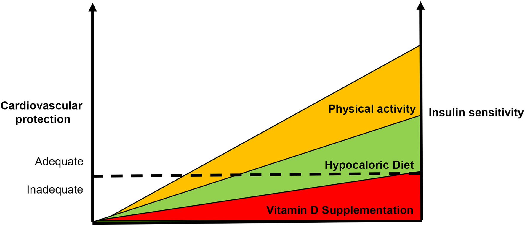 IR and deficiency of vitamin D, with few exceptions, are reversible conditions. In Western countries, physical inactivity and hypercaloric food intake are endemic behaviors. There is clear evidence that exercise training ameliorates insulin sensitivity (159, 160). Notably, physical exercise is associated with an increase of vitamin D levels, independently from sun exposure. In particular, the Third National Health and Nutrition Examination Survey (1988–1994) showed that in old individuals, the frequency of leisure-time physical activity was associated with levels of vitamin D detected in young subjects (161). These data were confirmed by further surveys (2007–2012) (162). Further studies demonstrated the positive effect of physical activity of vitamin D status in different cohorts. The ARIC study demonstrated that in whites but not in black individuals a linear relationship between physical activity and vitamin D levels was described (163).
