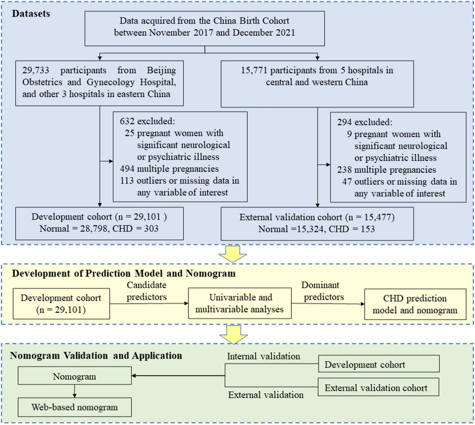 This was a retrospective study and we used data from the China Birth Cohort Study (CBCS), which is a population-based birth defect surveillance system in China from November 2017 to December 2021 (24). The CBCS was conducted in 38 research sites in 17 provinces, cities, autonomous regions, and municipalities covering most areas of China. We obtained data access permissions for 9 hospitals among them. Data of each participant including birth outcome, demographic characteristics, lifestyle behaviors, environmental pollution, maternal disease history, and the current pregnancy information were required to be reported by trained obstetricians, sonographers, and pediatricians for the same CBCS system. To build a robust nomogram, participants from four hospitals in eastern China, including Beijing Obstetrics and Gynecology Hospital, were used as a development cohort. Participants from five hospitals in central and western China were used as an external validation cohort. All participants’ data of the above nine hospitals were collected. For the development cohort, 29,733 participants were initially recruited. Of these, 25 participants were excluded because of significant neurological or psychiatric illness of pregnant women (the accuracy of questionnaires could not be guaranteed), 494 multiple pregnancies were excluded since etiology of CHD may be different between singleton and multiple pregnancies (18), and a further 113 participants were excluded due to outliers or missing data in any variable of interest. Thus, 29,101 participants (28,798 normal + 303 with CHD) were retrieved for inclusion in the development cohort. At the same time, 15,477 participants (15,324 normal + 153 with CHD) were used as the external validation cohort using the same criteria as for the development cohort (Figure 1 and Supplementary Table 1). The sensitivity analysis that excluded participants with missing data yielded results similar to those presented (data not shown). This study was guided by the Transparent Reporting of a Multivariable Prediction Model for Individual Prognosis or Diagnosis (TRIPOD) criteria (Supplementary Table 2) (25).