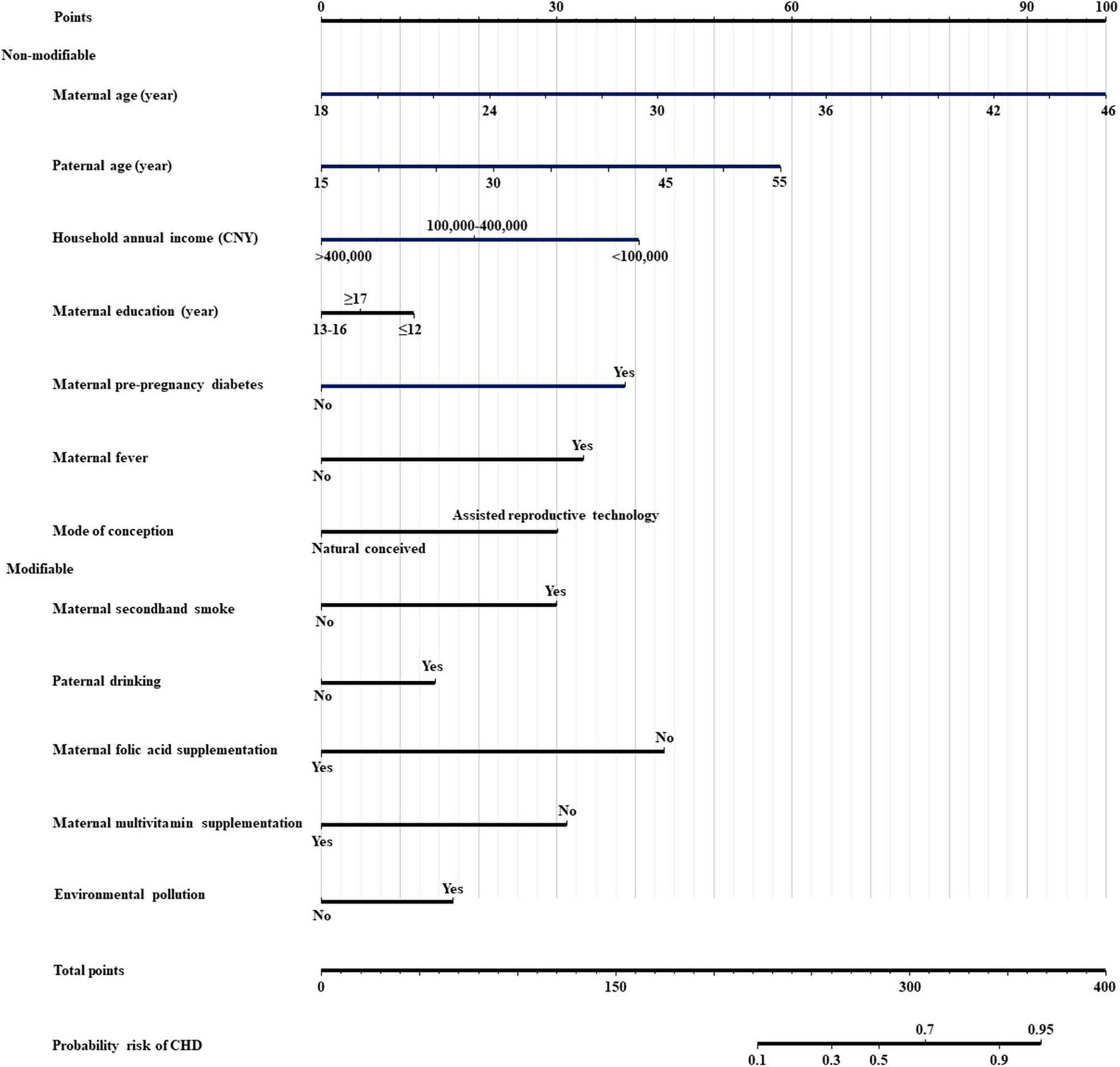Therefore, the aim of this study was to (a) identify and evaluate the dominant predictors of offspring CHD and (b) develop a predictive model and web-based nomogram to directly indicate the probability of offspring CHD occurrence of each pregnant woman.