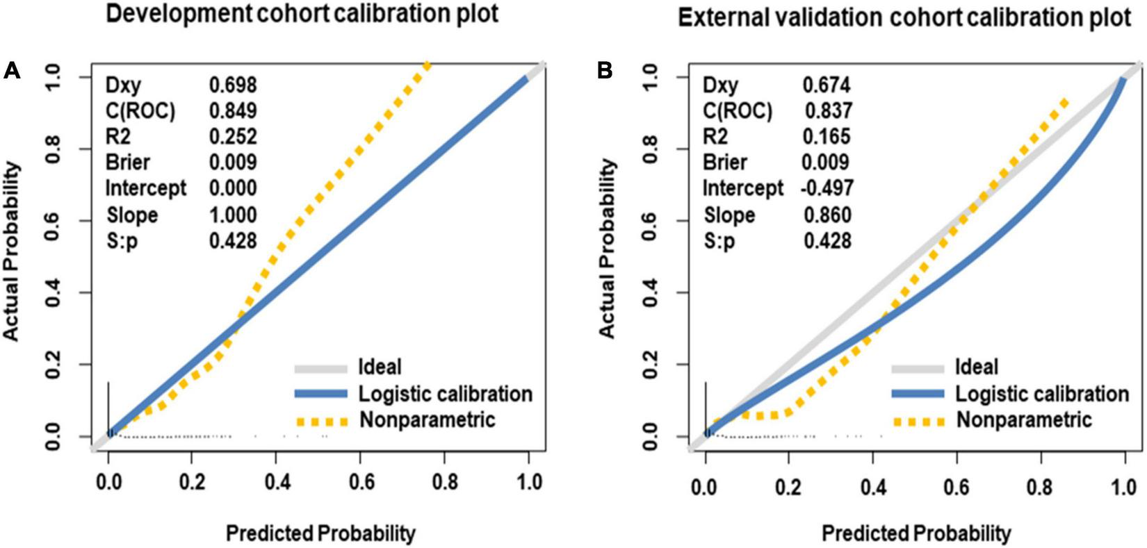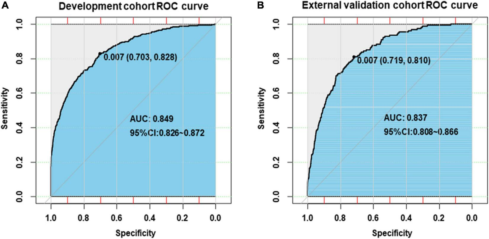 Data were given as a median (interquartile range) or n (%). The independent t-test and Mann–Whitney U test were used to analyze differences in continuous variables between groups, while the chi-square test and the Fisher’s exact test were used for categorical variables. The univariable and multivariable analyses were used to select the dominant predictors. The multivariable logistic regression analysis was used to construct a risk prediction model for offspring CHD, based on the selected predictors of the development cohort. The variables in the final multivariable model were selected by the bidirectional stepwise regression with the Akaike information criterion. The results were described as the odds ratio (OR) and 95% confidence interval (CI). In addition, the outliers and collinearity of multivariable regression model were assessed. A nomogram consisting of the dominant predictors was created to translate the prediction model into a visual scoring system to calculate the estimated probability of offspring CHD. Each predicator was assigned a “points” on the nomogram, based on its predictive ability for offspring CHD. High total points based on the sum of the assigned points for each predicator in the nomogram were associated with a high CHD probability. To validate the performance of the nomogram, both internal and external validations were conducted. For both of them, the discriminatory ability of the nomogram was assessed using the receiver-operating-characteristic curve (AUC); if the AUC was closer to 1, the nomogram was seen as having a good discriminatory ability (30); the calibration of the nomogram was assessed using the calibration curves. To assess possible overfitting, the Delong test was implemented to compare the AUCs. Besides, a web-based nomogram was created to directly indicate the patient-specific probability of offspring CHD occurrence. All statistical tests were performed using the R statistical software version 4.1.11. The statistical significance was assumed at P < 0.05.