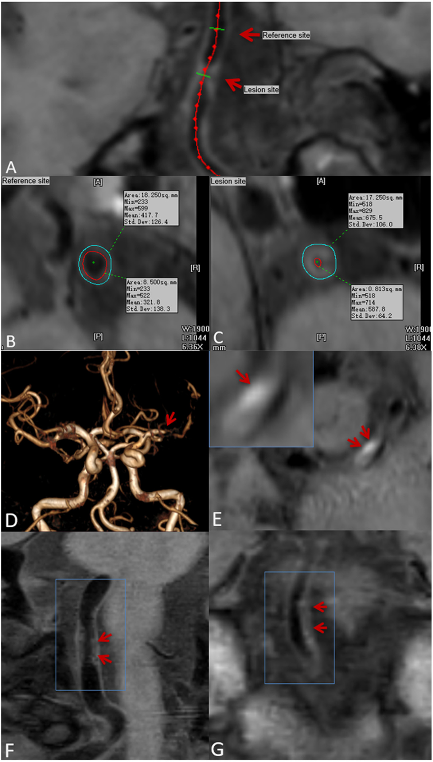 Plaque localization, composition, and surface morphology recognition. Ts-imaging software was used to perform curved planar reconstruction for the vascular axis. (A) (red arrow) with the thinnest wall as the reference site (B) and the thickest cross-section of the plaque as the lesion site (C). Lumen area (LA) and outer wall area (OWA) were calculated automatically by the software. Time-of-flight magnetic resonance angiography (TOF-MRA) showing stenosis of the M1 segment of the left middle cerebral artery (D) (red arrow): pre-contrast CMR vessel wall imaging shows an eccentric plaque at the stenosis, and a high-signal shadow can be seen in the plaque (E) (red arrow), indicating intraplaque hemorrhage. Plaque surface irregularity (F), and regularity (G) (red arrow).