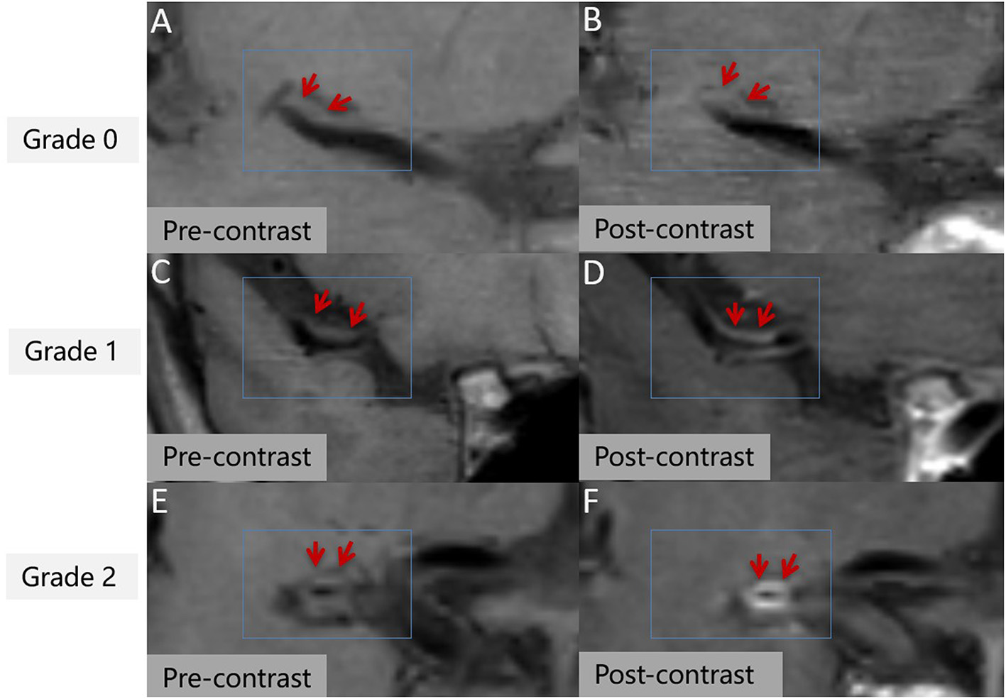Stenosis rate was defined as (1 – lesion LA/reference LA) × 100% (22). The mean values measured by the two reviewers was used for the subsequent analysis. With regard to T1 hyperintensity components, a high plaque signal was detected on T1WI, which was considered positive for intraplaque hemorrhage (23). A high signal intensity was defined as an area with an adjacent muscle signal intensity of >150% (Figures 1D,E) (24). The remodeling ratio (RR) was defined as OWA at plaque/OWA at reference. Three remodeling categories were defined as previously described: positive (outward expansion of the wall), RR > 1.05; intermediate, 0.95 ≤ RR ≤ 1.05; and negative (vessel wall shrinkage), RR < 0.95 (25). Regarding plaque surface morphology, an irregularity was defined as discontinuity at the plaque juxta luminal surface (Figure 1F) or smooth regularity at the plaque inner wall (Figure 1G) (22). Intracranial plaque enhancement was classified into three grades on post-contrast T1-VISTA images: grade 0, no enhancement, defined as the degree of enhancement similar to that of normal vessel wall; grade 1, defined as the degree of enhancement less than that of the pituitary infundibulum but greater than that of normal vessel wall; and grade 2, defined as the degree of enhancement similar to or greater than that of the pituitary infundibulum (Figure 2). For inconsistent cases, another senior neuroradiologist (with 10 years of experience in imaging-based diagnosis) reassessed images and assisted in reaching a consensus.