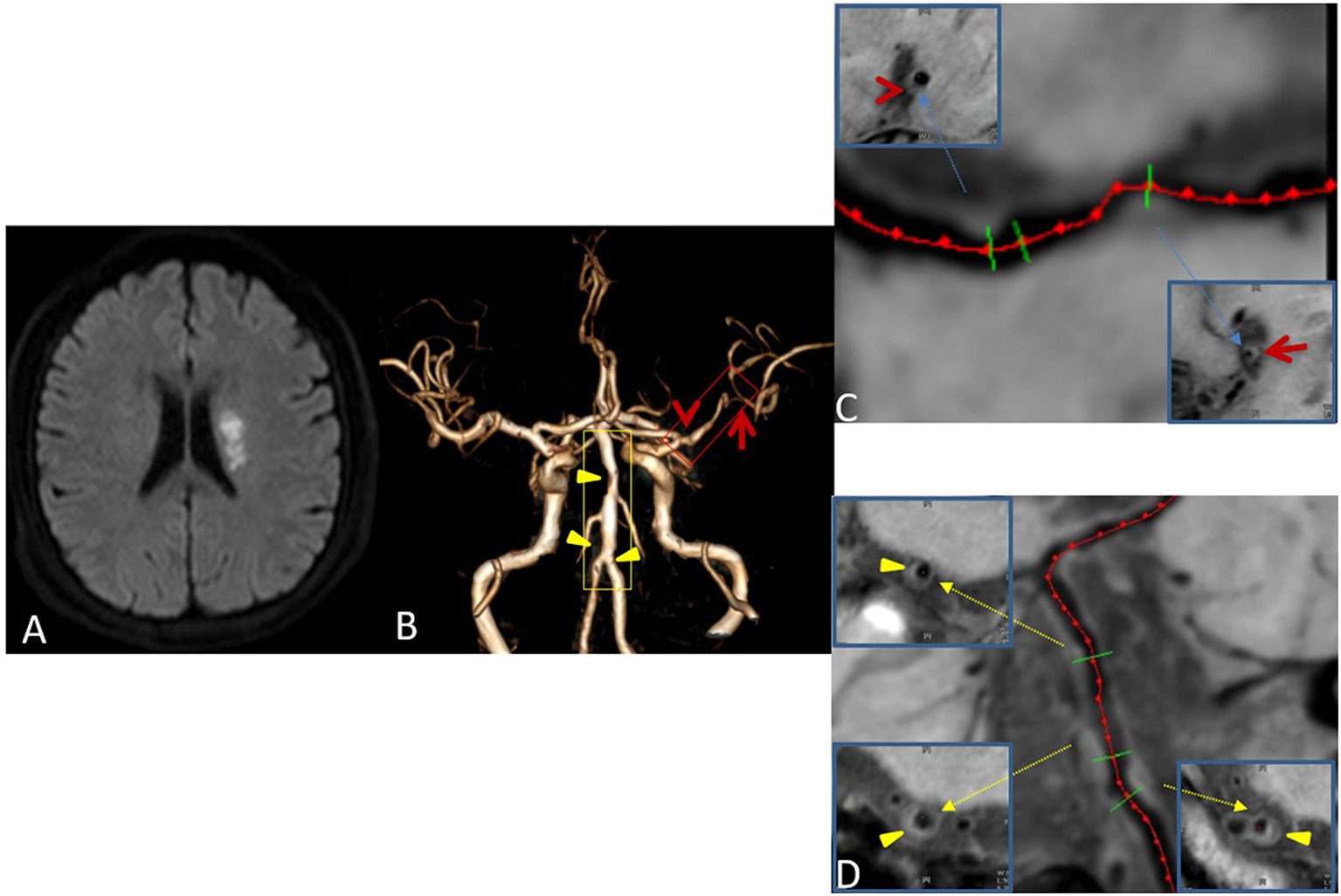 Plaque Classification. Male, 42 years old, presenting with sudden right limb weakness for 8 h. Diffusion-weighted imaging (DWI) shows acute left lateral paraventricular infarction (A). Time-of-flight magnetic resonance angiography (TOF MRA) shows stenosis at two sites in the M1 segment of the left middle cerebral artery (red box) and three sites in the basilar and left vertebral arteries (yellow box) (B). Curved planar reconstruction images show severe stenosis at the distal end of M1 as the culprit plaque (red arrow), and mild stenosis at the proximal end of M1 as an uncertain plaque (red Arrowhead) (C). The three plaques of the basilar artery and left vertebral artery are non-culprit plaques (Yellow triangular arrowheads) (D).