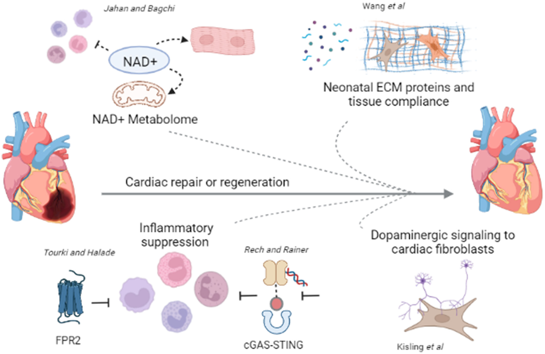 Broad and diverse mechanisms contribute to cardiac repair or regeneration. In the current topic issue, articles review the literature regarding NAD+ metabolome in CVD (Jahan and Bagchi), and inflammatory suppression via FRP2 activation (Tourki and Halade) or cGAS-STING inhibition (Rech and Rainer) in cardiac repair. Primary research articles demonstrate a role for ECM proteins and tissue compliance in cardiac regeneration (Wang et al.), and dopaminergic signaling to cardiac fibroblasts in cardiac repair post MI (Kisling et al.). Future studies should assess what molecular triggers can tip the balance to limit adverse remodeling and the pathogenesis of HF promoting the reparative processes. Figure was generated using Biorender.com.
