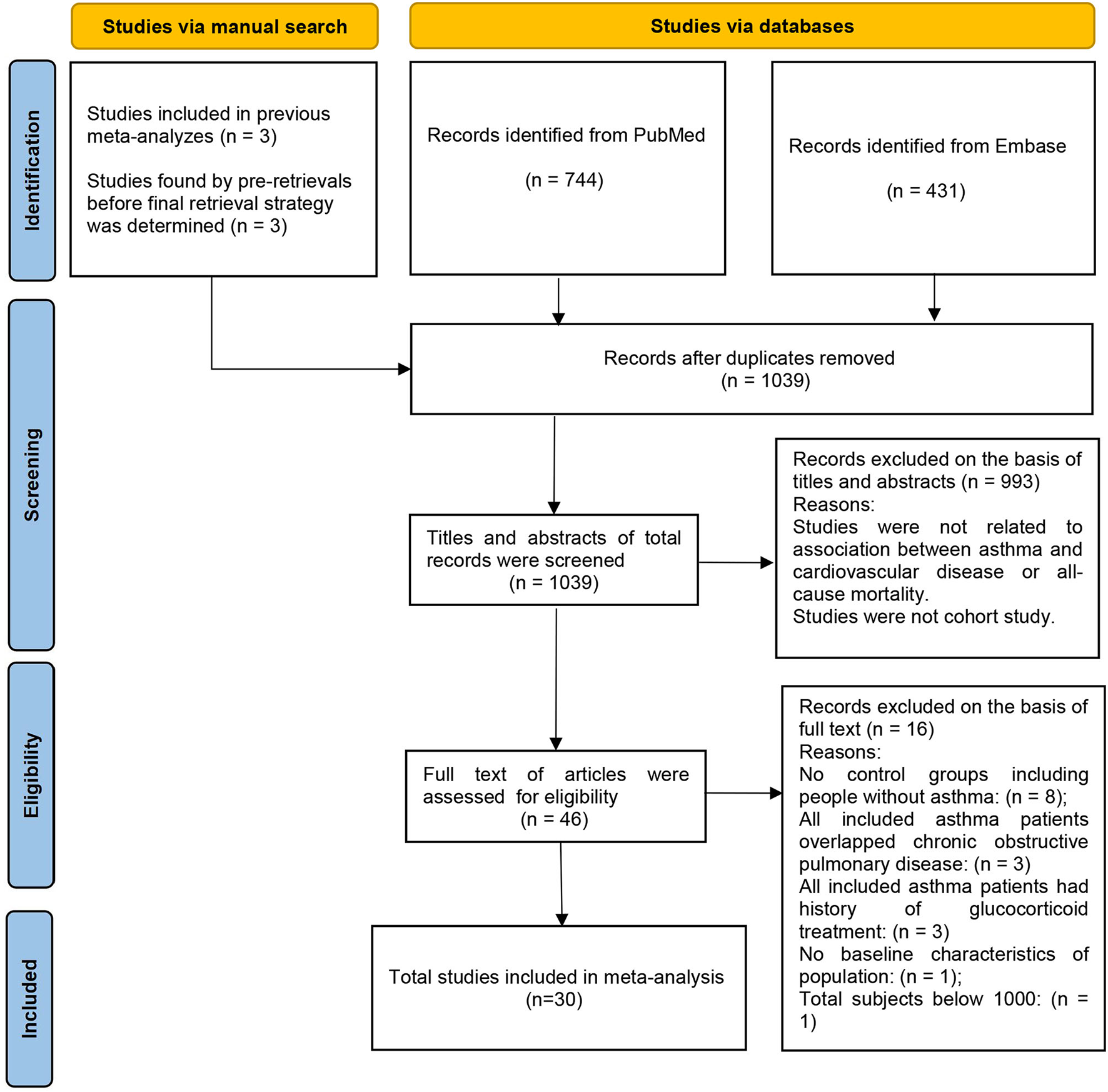 Thousand thirty nine studies were yielded by the electronic search of Pubmed and Embase databases and manual search. After applying the inclusion and exclusion criteria, 30 studies (17–46) were included in the meta-analysis, including 5 studies (42–46) assessed from the manual search and 25 studies (17–41) from the electronic database search (Figure 1).