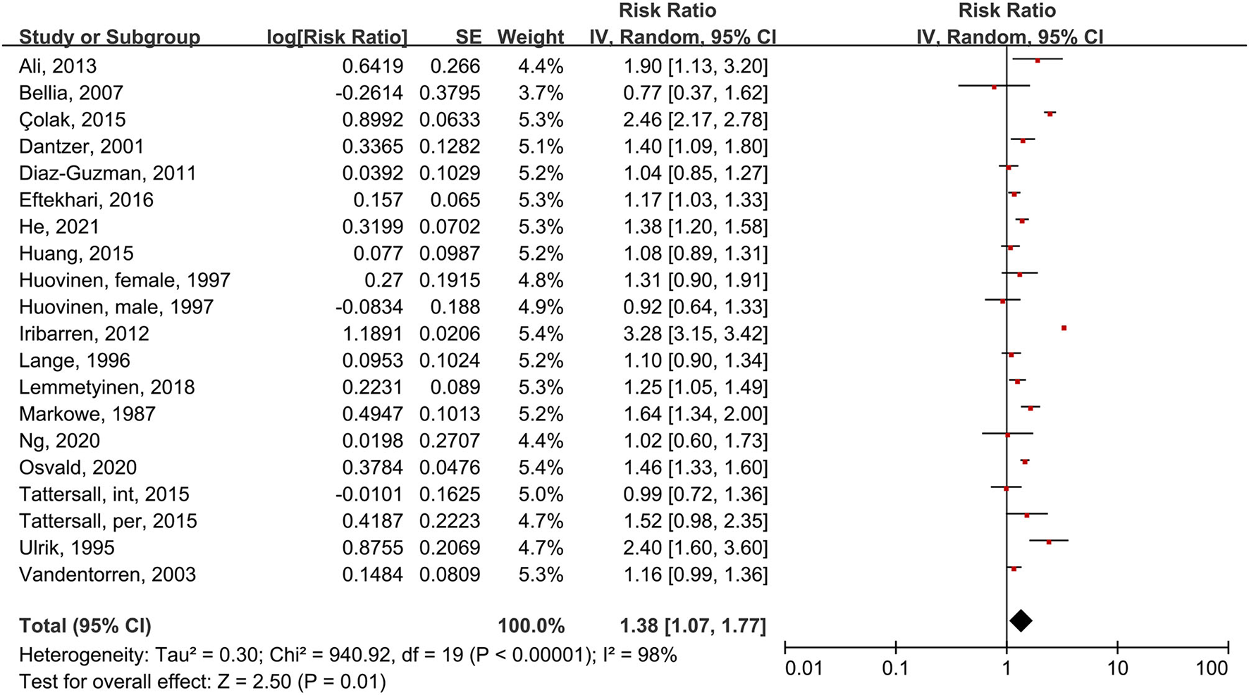 At first, we measured both adjusted and unadjusted RRs/HRs. Then, we pooled the adjusted RRs that were initially provided in the studies or estimated by the HRs. I2 statistic were used to evaluate the heterogeneity of included studies. when I2 >50%, significant heterogeneity was considered existing (16) and the random-effects model was used. Funnel plots were used to evaluate publication bias. RevMan 5.4.1 (Nordic Cochrane Center, Cochrane Collaboration) were used to conduct all calculations and draw forest plots to show the results. Stata version 14.0 (Stata Corp., College Station, TX, USA) were used for sensitivity analysis.