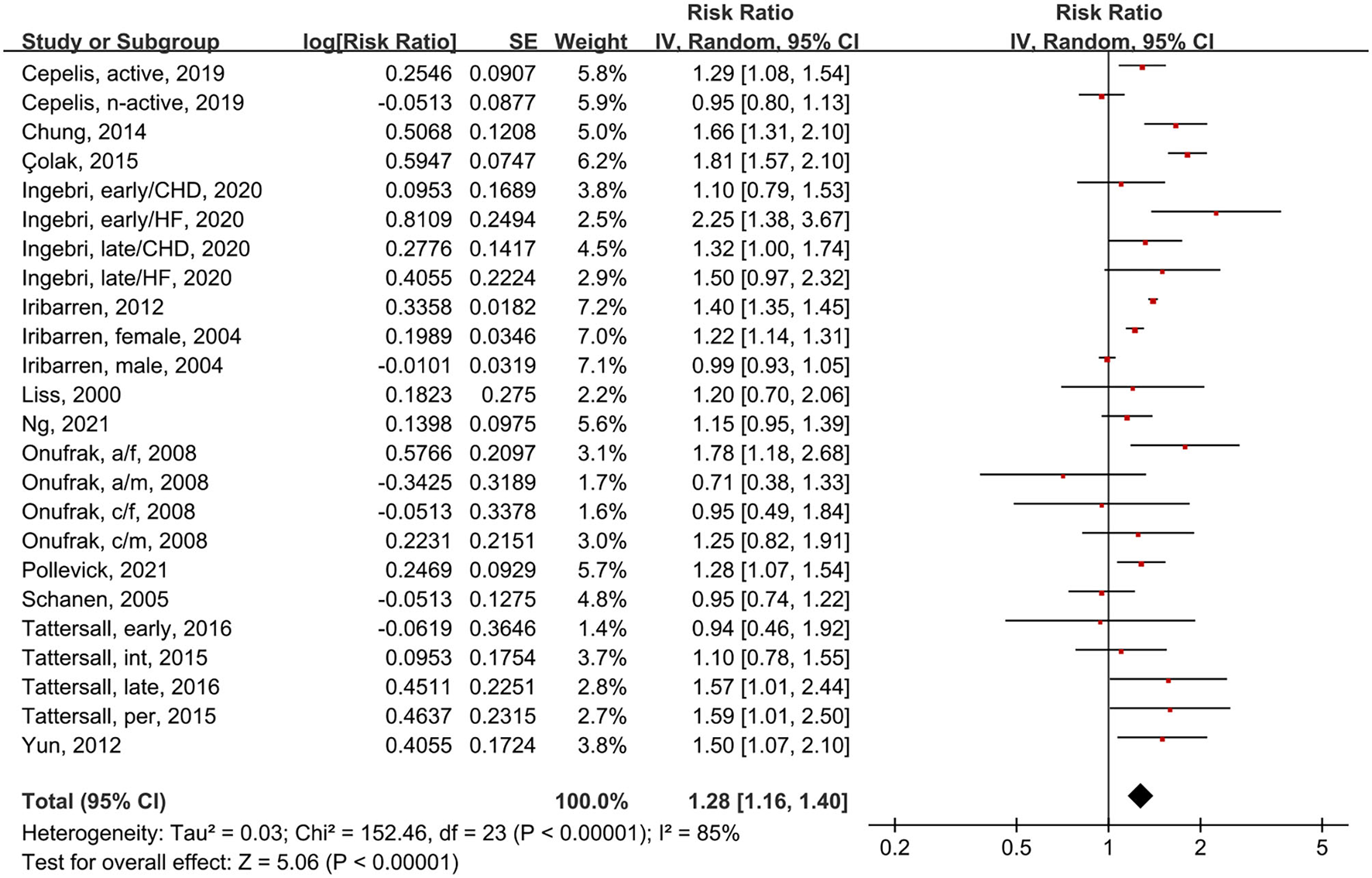 We analyzed 14 studies with a total of 24 subgroups (Figure 4). The random-effects model showed that asthma patients had a 32% increased risk of CVD compared to people without asthma (RR = 1.28, 95% CI = 1.16–1.40, p < 0.00001; I2 = 85%, p < 0.00001). Thus, asthmatic status increases the risk of CVD morbidity.