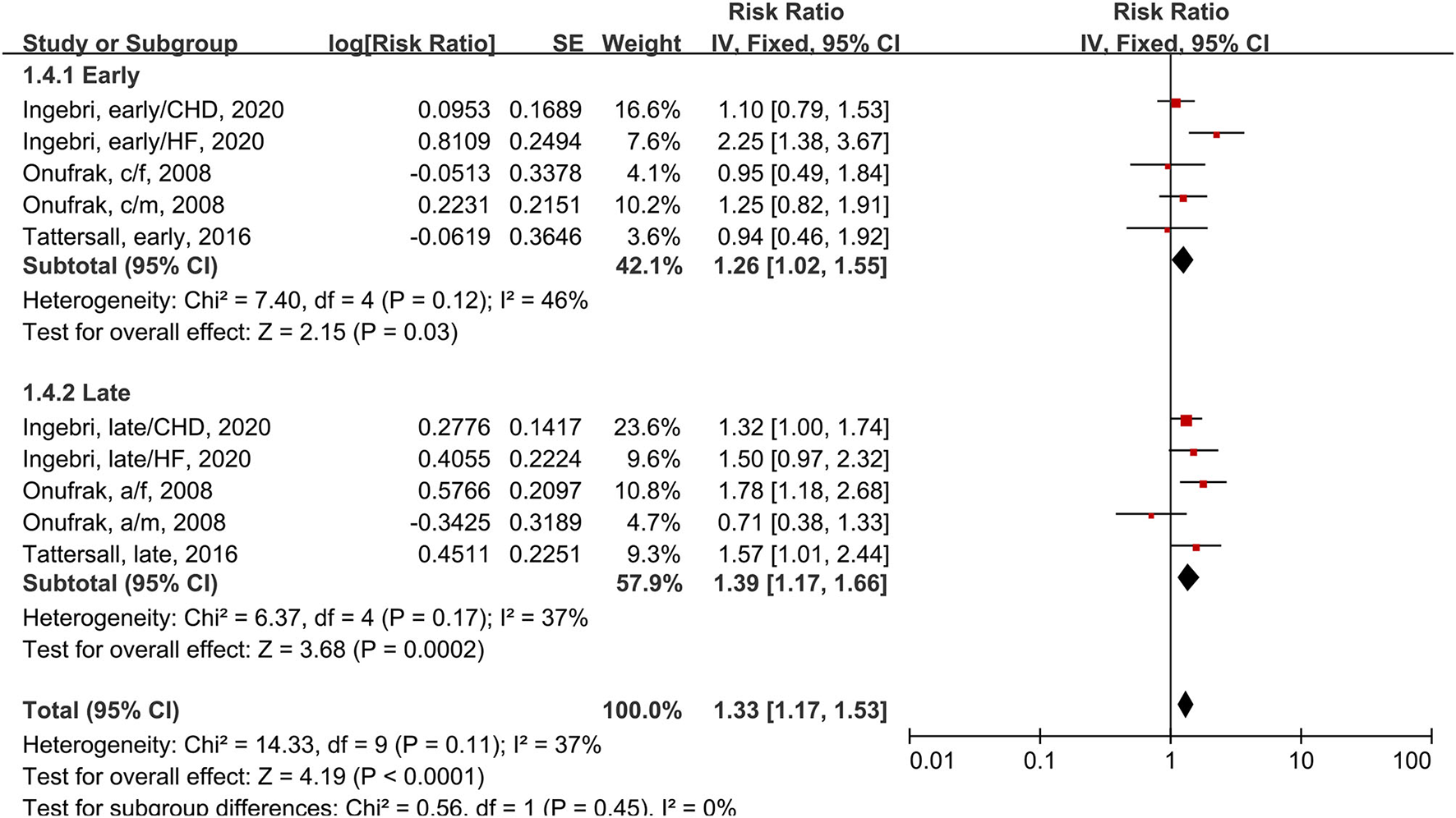 In the subgroup analysis of early and late-onset asthma using the fixed-effects model, three studies had a total of five subgroups (Figure 5). One study (34) defined early-onset as asthma onset prior to 18 years and late-onset as asthma onset at 18 years or older. The other two studies (25, 42) applied the cutoffs of 40 years and 21 years. Early-onset asthma patients has a 26% increased risk of CVD compared to people without asthma (RR = 1.26, 95% CI = 1.02–1.55, p = 0.03; I2 = 46%, p = 0.12). Late-onset asthma patients had a 39% increased risk of CVD compared to people without asthma (RR = 1.39, 95% CI = 1.17–1.66, p = 0.0002; I2 = 37%, p = 0.17). This subgroup analysis reduced the heterogeneity of studies.