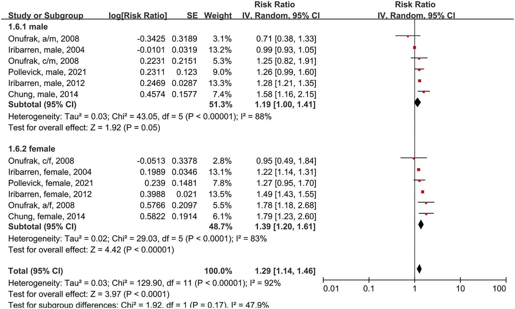 Forest plot shows association between asthma and CVD morbidity in male and female asthma patients. SE, standard error; IV, Inverse Variance method; df, degrees of freedom; a/f, adult female; a/m, adult male; c/f, child female; c/m, child male.
