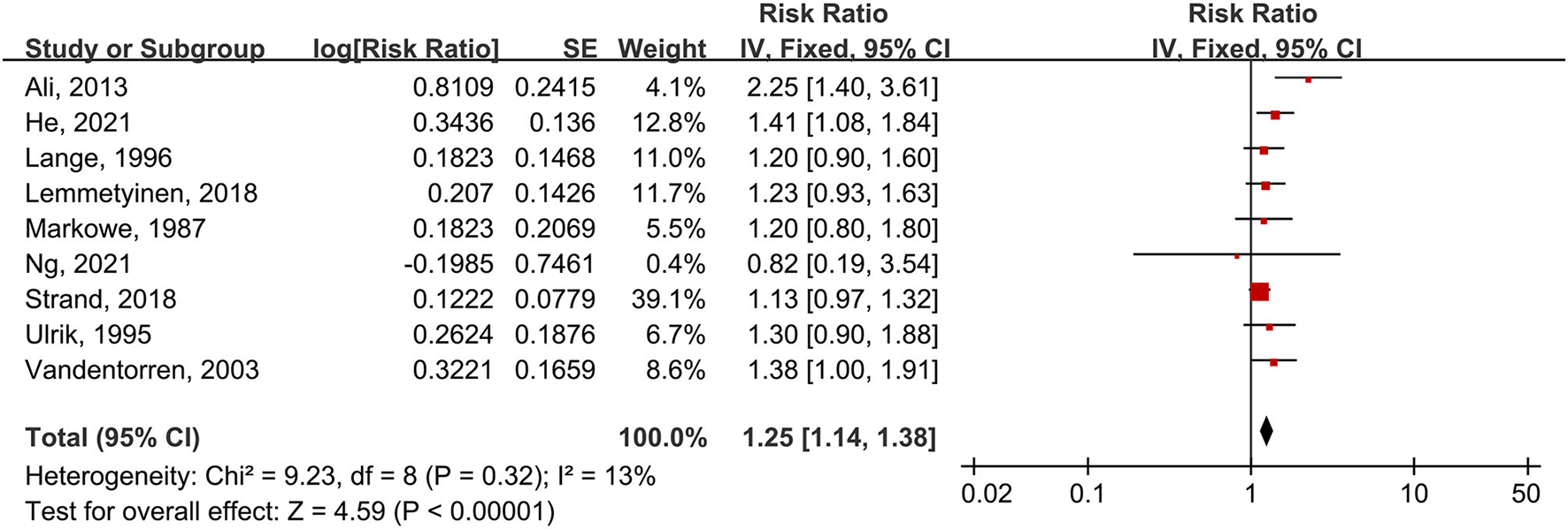 Nine studies provided the outcomes of CVD mortality in asthma patients. These studies were summarized for the first time (Figure 7). Data calculated by the fixed-effects model showed that asthma patients have a 25% increased risk of CVD mortality compared to people without asthma (RR = 1.25, 95% CI = 1.14–1.38, p < 0.00001). There was no considerable heterogeneity between these studies (I2 = 13%, p = 0.32). Eight of nine studies yielded an increased risk of CVD mortality in asthma patients. Six of nine studies were regarded as high quality.