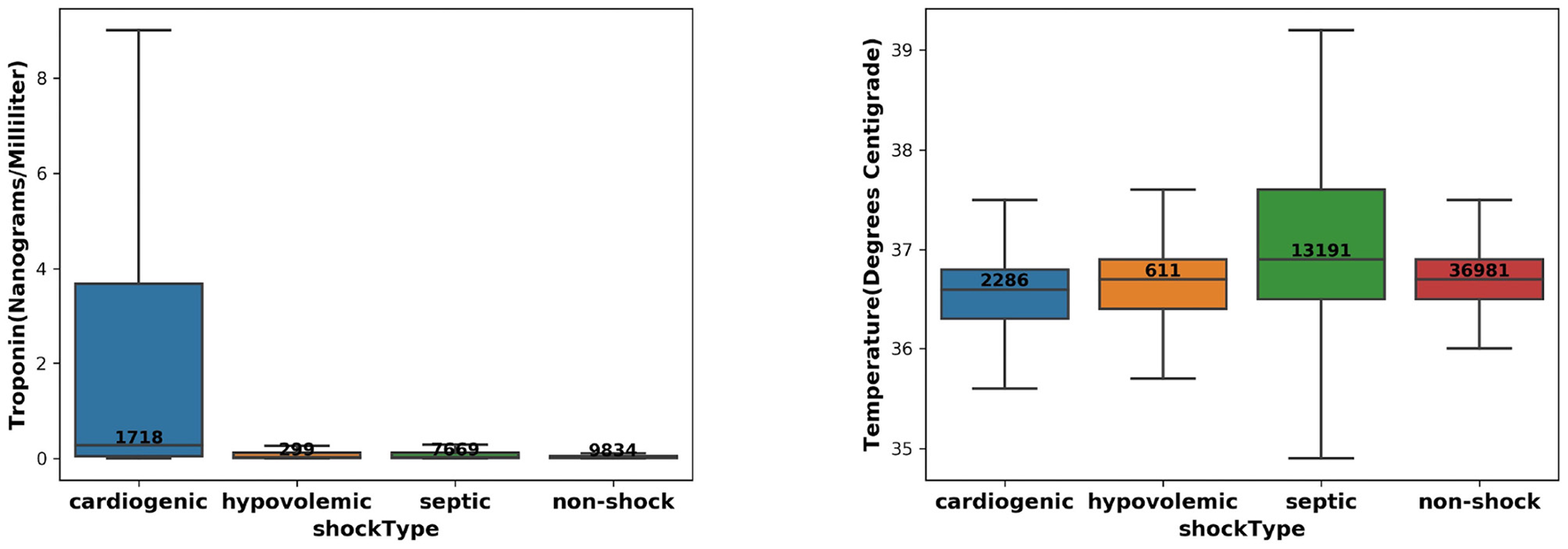 We took the input variables extracted at 2 h before the intervention onset and compared the distribution of Temperature and Troponin over the target and control patient groups. The results are shown in Figure 1 and show that (1) CS patients have the highest Troponin levels; (2) Septic shock patients have highest Temperature. These were consistent with pathophysiology and existing literature (10–13), which can serve as a “sanity check” on the reliability of the extracted patient cohort.
