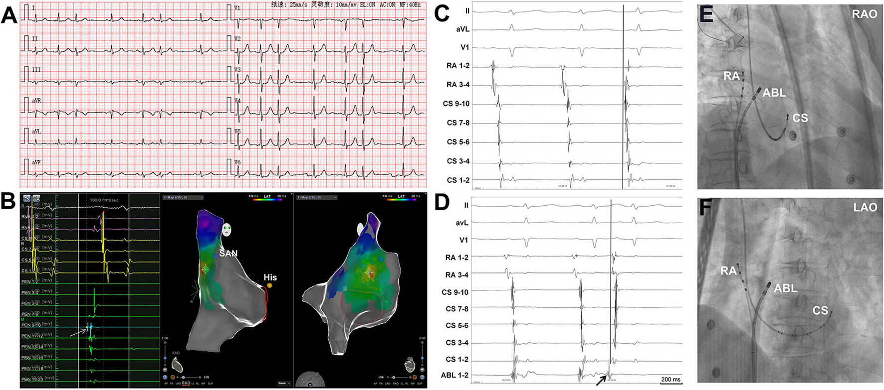 Simultaneous recordings of the right atrium (RA) and coronary sinus (CS) showing the differentiation of spontaneous PACs from PACs induced by catheter manipulation. (A) Surface ECG tracings during spontaneous PACs showing the P-wave morphology. The P-wave morphology in most of the leads is not clearly seen. (B) The 3D mapping shows that the origin site of the PACs is located at the high crista terminalis. The light blue dot indicates the earliest activation point of PACs. The dark blue dot indicates the sinoatrial node. The yellow dot indicates the His bundle. A double sharp atrial potential was recorded in the PentaRay catheter 9-10 (PEN 9-10, the arrow and the light blue dot) and the first atrial potential precedes surface ECG P wave in lead V1 by 40 ms. The RVA channels were connected to the RA catheter. (C) Surface ECG, RA, and CS tracings during spontaneous PAC and PAC induced by mapping catheter manipulation (D). During spontaneous PAC, the proximal RA activation is earlier than the distal RA activation and the atrial activation sequence in CS is from proximal to distal. The proximal RA activation is earlier than the proximal CS activation. During PAC induced by the mapping catheter manipulation (arrow, the catheter was in high RA), the proximal RA activation is almost simultaneous to the distal RA activation and the distal CS atrial activation is earlier than the proximal CS atrial activation. (E) and (F) Radiographs of RA, CS, and ABL catheters. 3D, three dimensional; ECG, electrocardiogram; PAC, premature atrial contraction; SAN, sinoatrial node; ABL, ablation catheter; LAO, left anterior oblique projection; RAO, right anterior oblique projection.