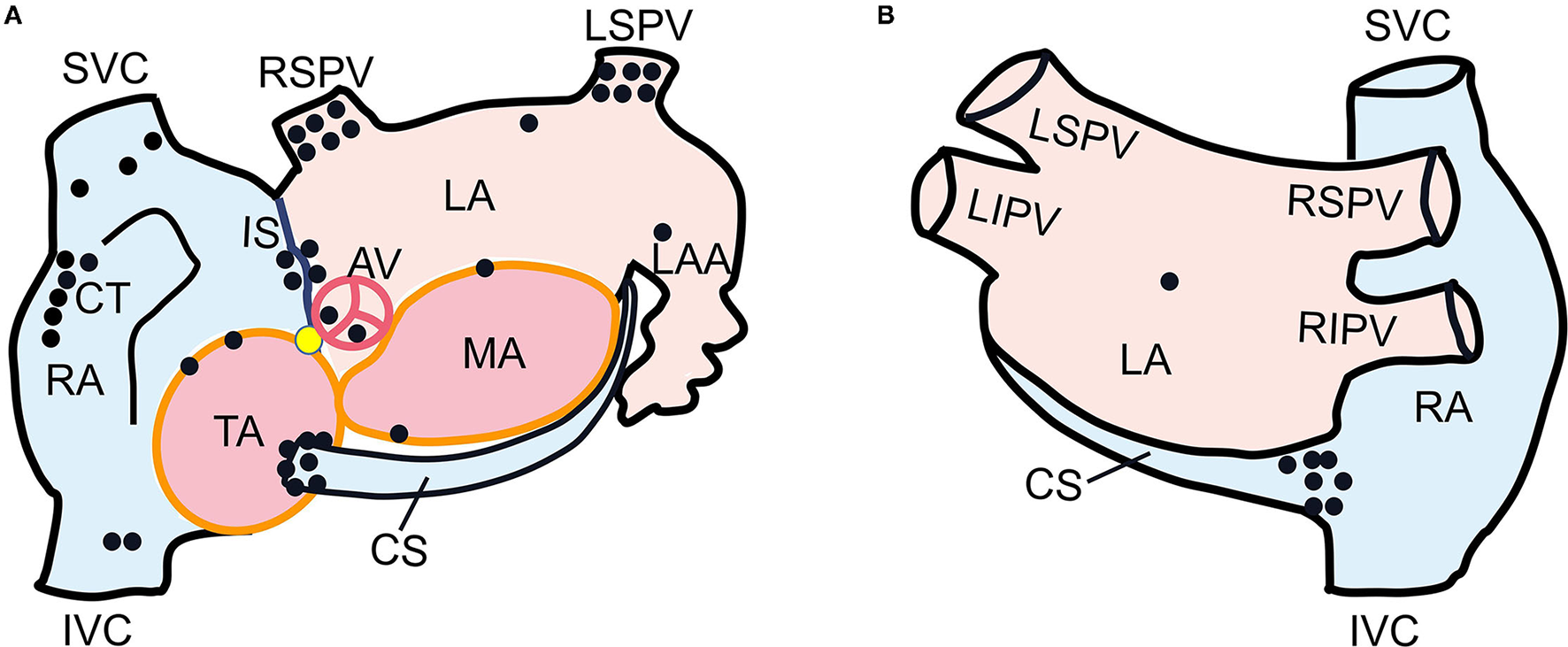 Schematic diagram of left anterior oblique (A) and postero-anterior (B) views of dual atria showing the successful ablation target sites in 43 patients. Each black dot represented one ectopic focus. The yellow dot indicated His bundle. SVC, superior vena cava; IVC, inferior vena cava; RA, right atrium; CT, crista terminalis; CS, coronary sinus; TA, tricuspid annulus; IS, interatrial septum; LSPV, left superior pulmonary vein; RSPV, right superior pulmonary vein; MA, mitral annulus; LA, left atrium; LAA, left atrial appendage; AV, aortic valve.