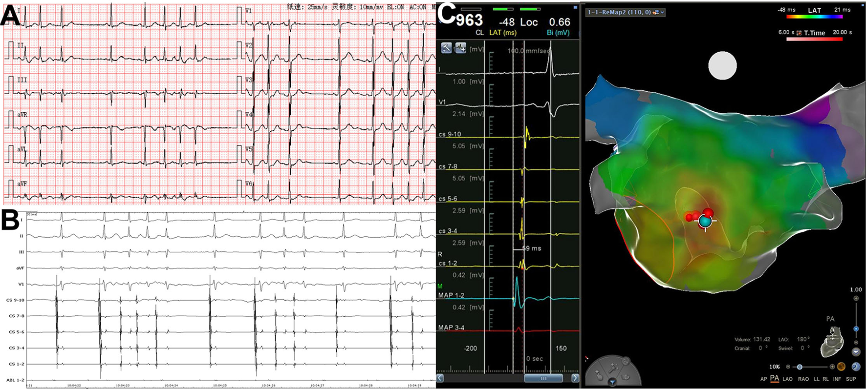 Radiofrequency catheter ablation (RFCA) has been the first-line therapy for a variety of tachyarrhythmias, including paroxysmal supraventricular tachycardia, atrial tachycardia, atrial flutter, and symptomatic atrial fibrillation (1–3). Frequent premature atrial contractions (PACs) in patients without structural heart disease are usually symptomatic and refractory to antiarrhythmic drugs (AADs) (4–6). Without proper treatment, frequent PACs could induce PAC-related cardiomyopathy (7–9). To date, there are no guidelines or expert consensus providing recommendations on RFCA for PACs. Recently, a few reports have demonstrated the feasibility and efficacy of RFCA for symptomatic PACs related to atrial fibrillation (4, 5, 10). However, the mapping and ablation of PACs are usually challenging as catheter manipulation in the atrium often provokes PACs, making it hard to differentiate these PACs from the clinical PACs due to the small amplitude of P wave.