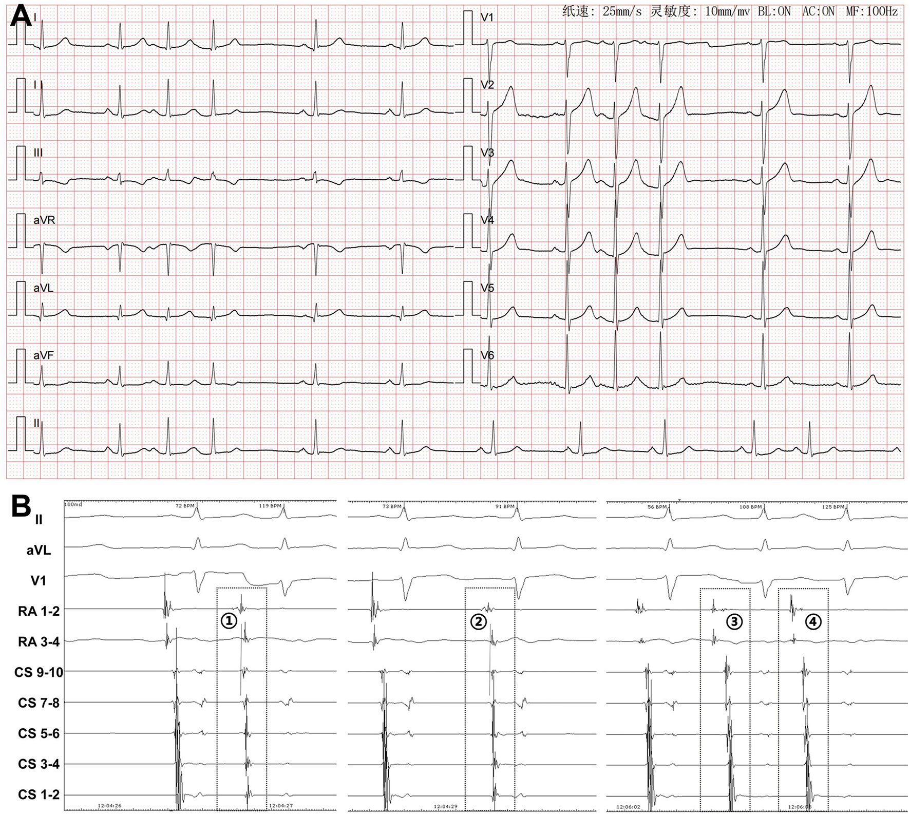 Differentiation of spontaneous PACs and PACs induced by catheter manipulation during mapping procedure. (A) Twelve-lead surface ECG tracing during PACs. The P wave morphology is positive in precordial leads, inferior leads, and lead I, and negative in lead aVR and isoelectrical in lead aVL. (B) Simultaneous recording of surface ECG leads II, aVL, V1, RA1−2, RA3−4, and CS9−10~CS1−2. During spontaneous PAC (PAC), the distal RA activation is earlier than the proximal RA activation and the atrial activation sequence in CS is from proximal to distal. The atrial activation in CS9−10 is earlier than that in RA3−4. During PAC induced by the catheter manipulation (PAC~), both the RA and the CS atrial activation time and sequences are useful for differentiation. At first glance, PAC may be thought to be a spontaneous PAC. However, different coupling intervals, as well as the fact that the atrial activation in RA3−4 is earlier than that in CS9−10 confirm it as a manipulation-induced one. In PAC , the atrial activation in RA3−4 is earlier than that in RA1−2. In PAC , the atrial activation in RA3−4 is significantly earlier than that in CS9−10. These differences indicate that both PAC and PAC are induced by catheter manipulation. RA, right atrium; CS, coronary sinus; ECG, electrocardiogram; PAC, premature atrial contraction.