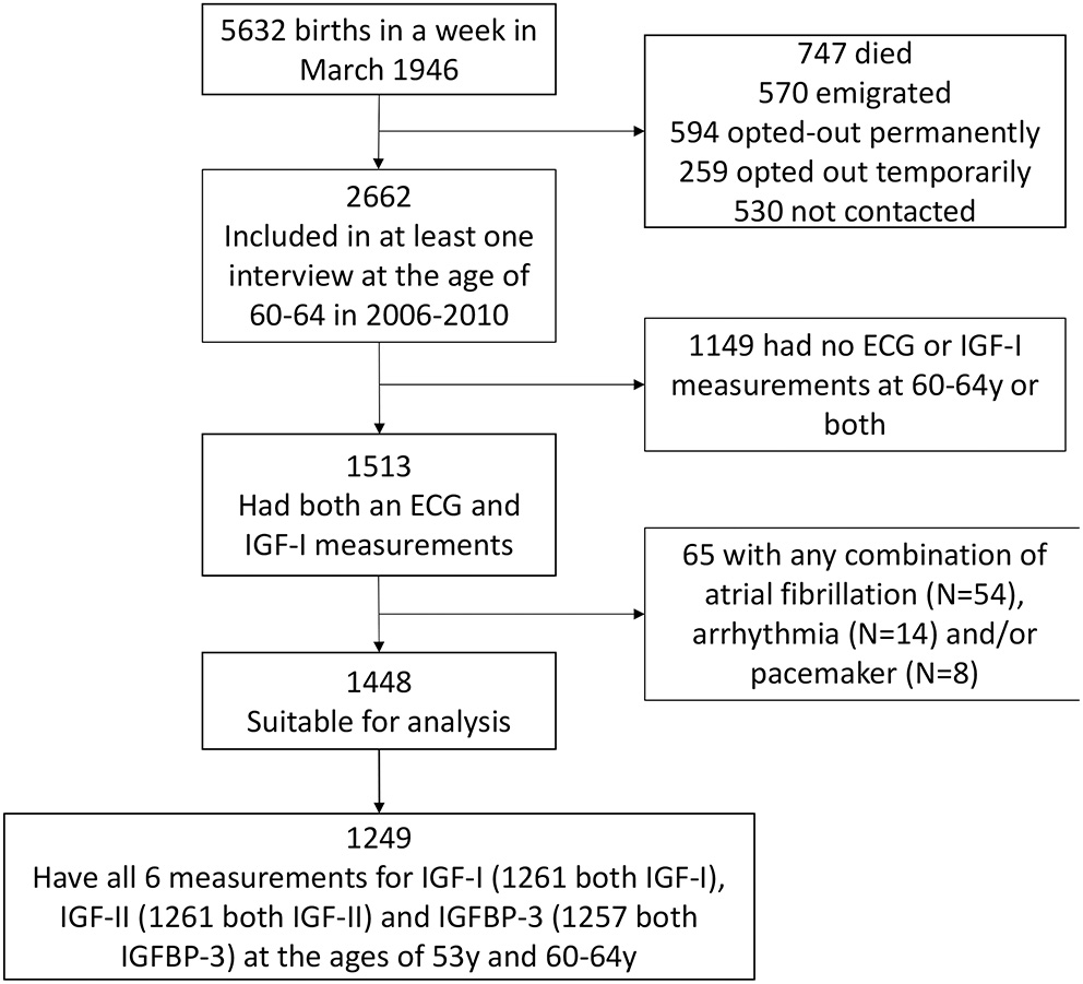 Consort diagram of the recruitment process. The Medical Research Council National Survey of Health and Development (NSHD) consists of 5,362 individuals recruited in 1 week in March 1946 in Britain. The exposures of interest here were metabolic markers at 60–64 years while the outcome was QTc interval derived from resting 12-lead electrocardiography (ECG) during the same clinic visit. Both pieces of data were available for 1,513 out of the 5,362 participants. The number of participants involved int the study is presented in the figure below. ECG, electrocardiography; IGF-I, insulin-like growth factor 1; IGF-BP3, insulin-like growth factor binding protein 3.