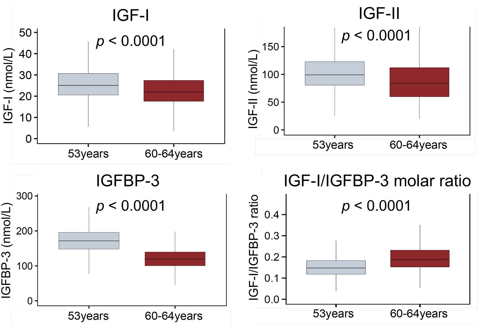 | IGF-I/IGFBP-3 molar ratio at 53y | 0.148 (0.065) | 0.147 (0.068) | 0.151 (0.061) | 0.145 (0.064) | 0.148 (0.065) |