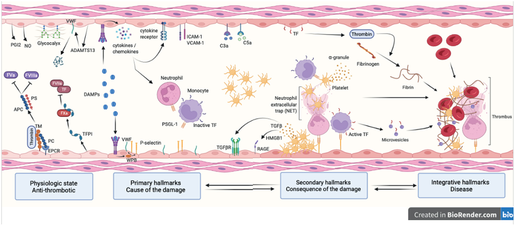 Endothelial cells play critical roles in regulating immune functions including cytokine secretion, phagocytic function, antigen presentation, PAMPs and DAMPs sensing, immune cell trafficking and cell extravasation. Increased permeability of the endothelium during inflammation is an important underlying cause of almost all endothelial-related destructive sequelae to the vascular wall. Breakdown of the complex balance between pro- and anti-coagulant systems as a result of acquired disturbances often result in thrombosis.