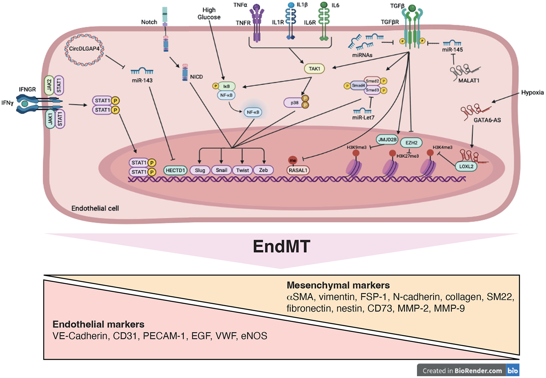 Signaling pathways and mechanistic drivers of endothelial-to-mesenchymal transition (EndMT). Stimulation with transforming growth factor-β (TGFβ), cytokines, Notch ligands, high glucose and hypoxia induce expression of transcription factors, such as Twist, Slug, Zeb and Snail resulting in EndMT. Epigenetic mechanisms including modifications of histone methylation marks and methylation of CpG island are induced. These processes are mediated by variety of actors such as microRNAs (miRNAs), long non-coding RNA (GATA6-AS and MALAT1), circularRNA (DLGAP4) and signaling pathways including SMAD, STAT, NFκB, and p38, promoting EndMT.