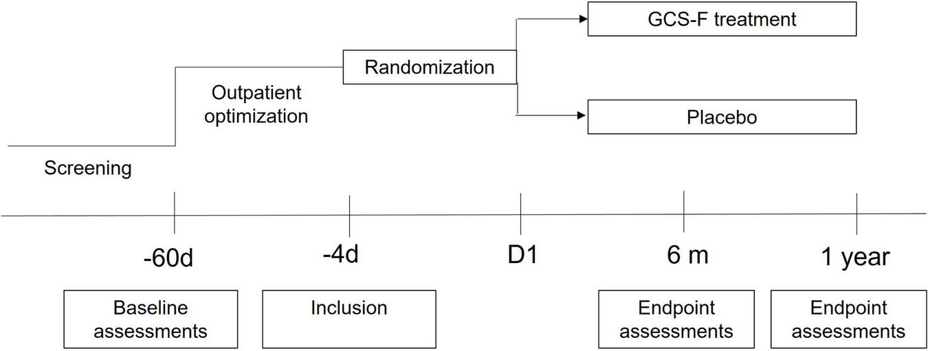 Study time chart. Patients were screened for eligibility before optimization of pharmacological therapy for at least 8 weeks. Patients included in the study were randomized to receive granulocyte-colony stimulating factor (G-CSF) or placebo and were followed up for 12 months.