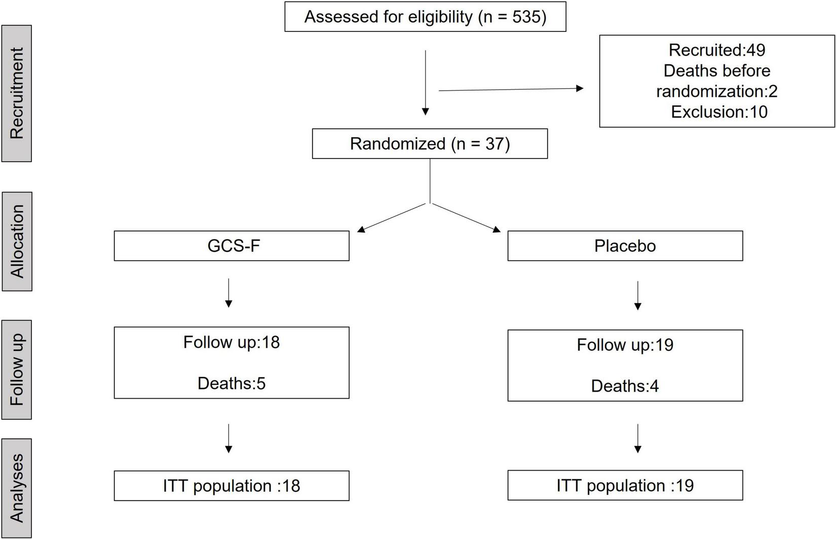 There were 11 deaths during the study, two of which happened before randomization. Overall mortality was 24.3% and, out of the nine remaining deaths, five occurred in the treatment group and four in the placebo group. Fifty-nine serious adverse events (SAE) were reported, none of which were related to G-CSF treatment. The classification of SAEs and their frequency per treatment group is presented in Table 3.