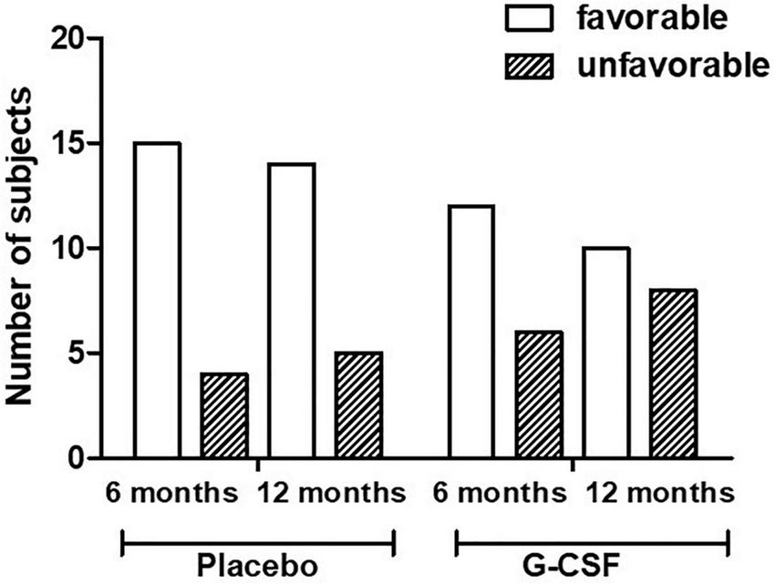 N-terminal pro-BNP (NT-proBNP) concentration was measured at enrollment and at 12 months, and no statistical significance was detected between the groups at both time points (p = 0.47 and 0.86, respectively) (Supplementary Table 1). Finally, tumor necrosis factor-alpha (TNF-α) concentration was measured as an exploratory analysis. We found a significant increase in TNF-α concentration at days 5 and 47 during the G-CSF application period, followed by a decrease in concentration until the values were similar to those in the placebo group at 12 months (p = 0.69) (Supplementary Table 2).