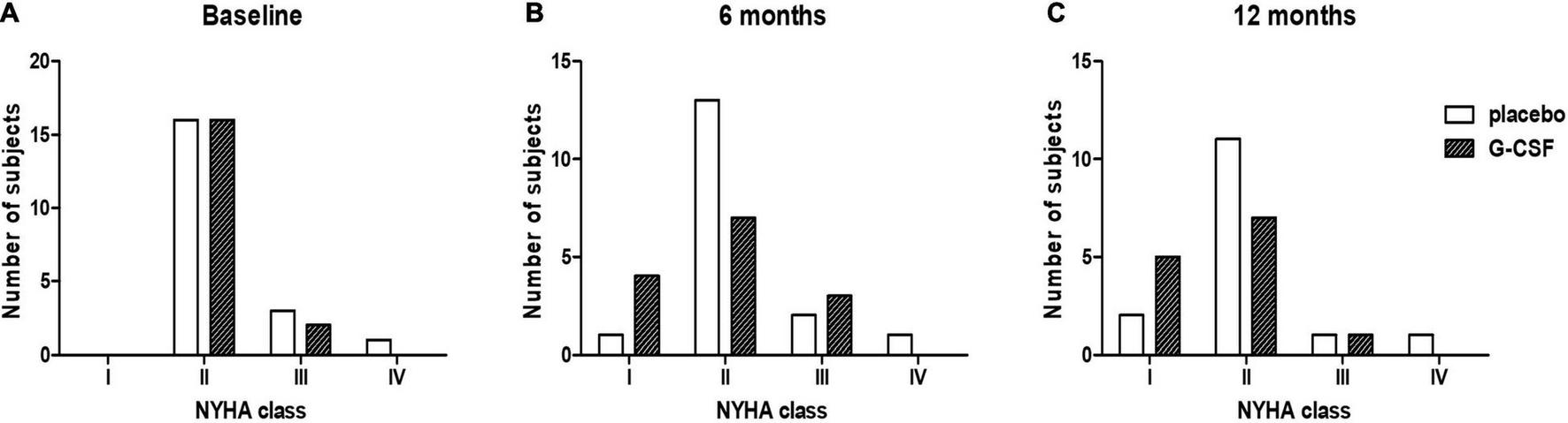 The baseline characteristics of the subjects were similar between the treatment groups (Table 1). The primary outcome was measured by evaluating NYHA functional class improvement, comparing baseline with 6 and 12-month data. All 37 subjects were included in this intent-to-treat analysis. Death before end of follow-up was considered as deterioration. The overall frequency of either maintenance or improvement of clinical condition was primary endpoint was 78% (95% CI 0.60–0.97) vs. 66% (95% CI 0.40–0.86), p = 0.47, at 6 months and 68% (95% CI 0.43–0.87) vs. 72% (95% CI 0.46–0.90), p = 0.80, at 12 months in placebo and G-CSF groups, respectively (Figure 3). The distribution across the NYHA classes in both groups at inclusion (T = 0) and at 6 and 12 months after treatment is shown in Figure 4.