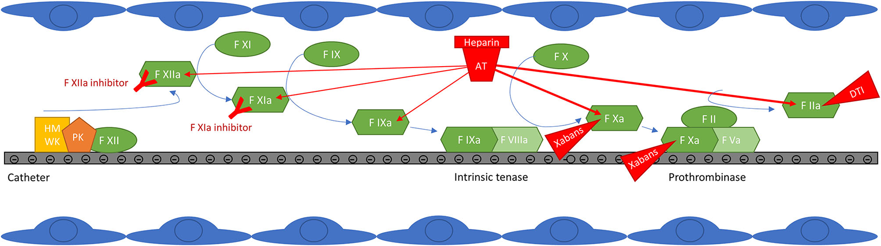 Contact pathway activation at the surface of catheters and targets of anticoagulant drugs. Factor XIIa auto-activates on contact with negatively charged surfaces. High molecular weight kininogen (HMWK) is also adsorbed and serves as a cofactor for FXIIa auto-activation. FXIIa then activates FXI to initiate thrombin generation, but also prekallikrein (PK) to kallikrein, resulting in further FXIIa generation. FXIa activates FIX, which forms the intrinsic tenase with FVIIIa. Intrinsic tenase and prothrombinase complexes form on negatively charged surfaces, classically on the surface of activated platelets, but possibly also on the surface of catheters. The thrombin generated then amplifies the reaction by promoting the activation of factors XI, VIII and V, but it is also a potent platelet activator. In addition to the generation of thrombin initiated by FXIIa, other thrombotic mechanisms take place on the surface of catheters (not shown in the figure): the adsorption of proteins such as fibrinogen, which promotes the adhesion and activation of platelets and leukocytes, potentially increasing thrombin generation and thrombogenesis (47–51). FXIIa, kallikrein and thrombin also activate the complement system which promotes platelet activation and thrombin generation (53–57). The effect of anticoagulant drugs is also depicted: unfractionated heparin (UFH) potentiates the inhibitory effect of antithrombin (AT) mainly on free activated factors X and II, but also to a lesser extent on free activated factors IX, XI and XII (86); clot-bound FXa and FIIa, and FXa within the prothrombinase complex, are less accessible to inhibition by AT (87–89). Direct oral anticoagulants (direct F Xa inhibitors (xabans) and the direct thrombin inhibitor (DTI) dabigatran) directly inhibit activated factor II or X, free, within the prothrombinase complex and clot-bound (89–92). Contact pathway inhibitors specifically target factor XI or XII; truncated antibodies against FXIa or FXIIa are shown in the figure, but this category also includes small inhibiting molecules, antisense oligonucleotides and small interfering RNAs (82).