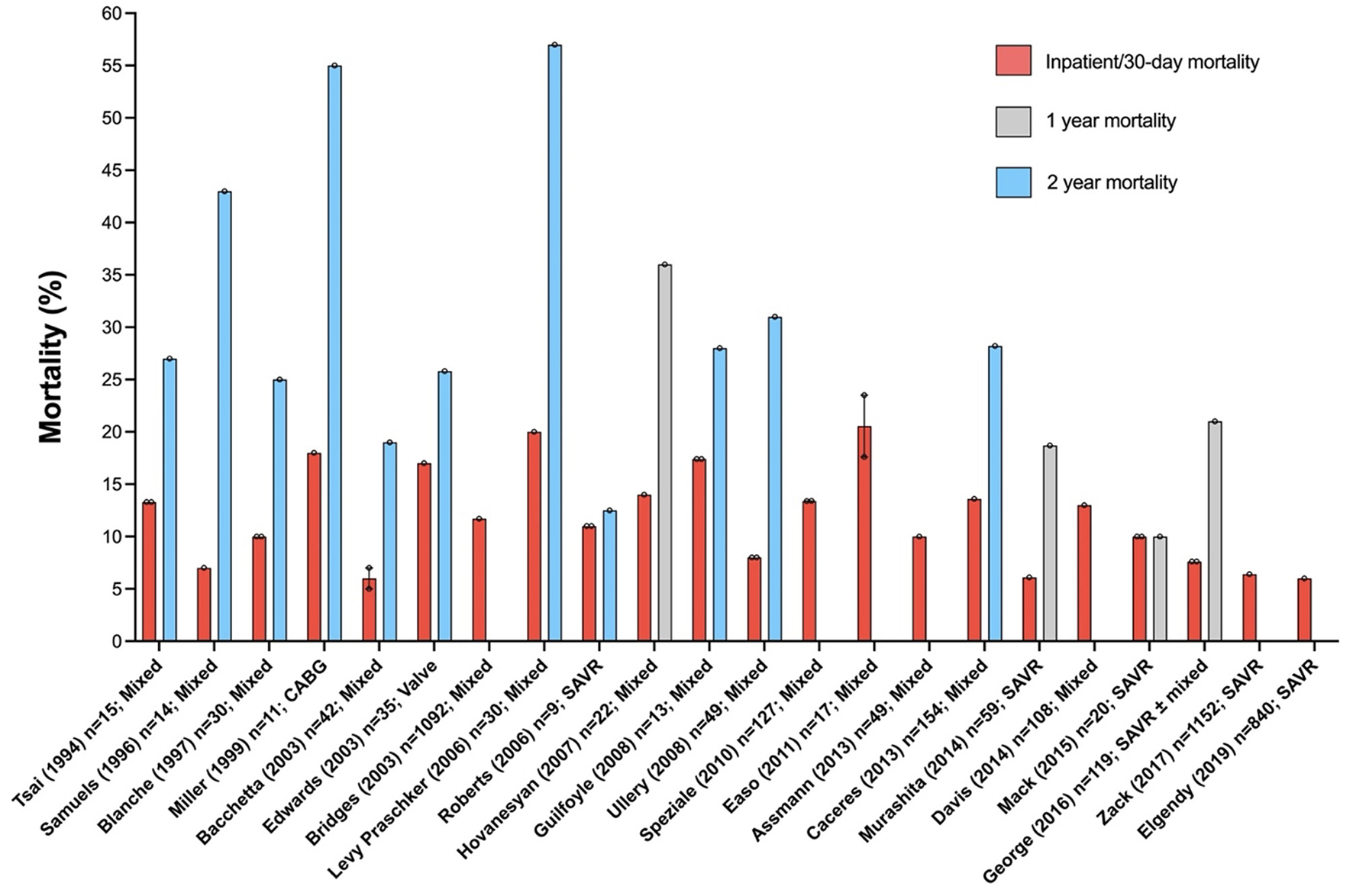 | Aortic valve replacement, CABG | 2 (11%) | N/A |