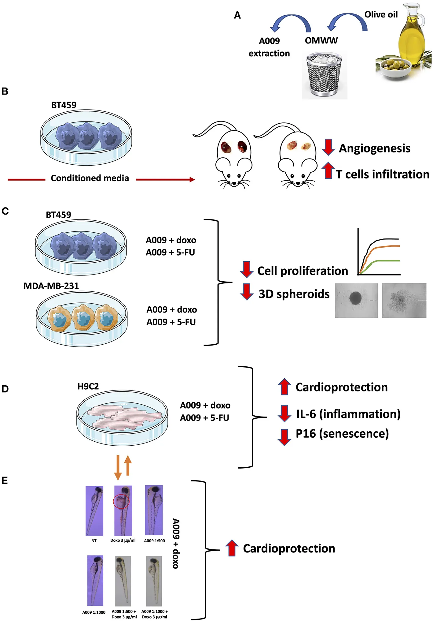 Our study suggests that in a cardio-oncological prevention perspective, a polyphenol-rich purified OMWW extract A009 combined with cancer chemotherapy, could represent a potential candidate for cardiovascular protection in patients with BC, while increasing effects of BC chemotherapy.