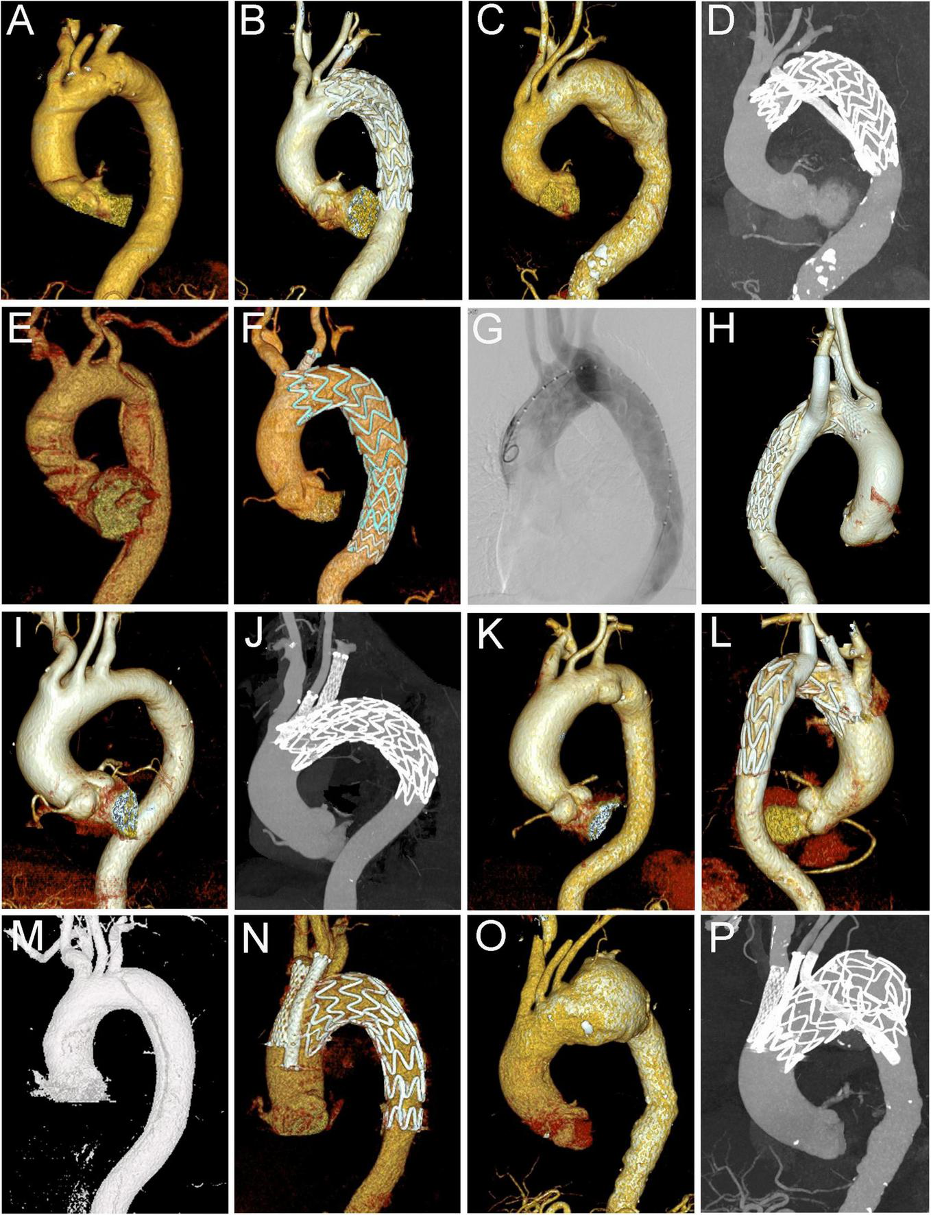 Different types of cTEVAR in the study. (A,B) Chimney stent in LSA; (C,D) snorkel stent in LSA; (E,F) chimney stent in LCCA; (G,H) chimney stent in LSA and snorkel stent in aRSA; (I,J) chimney stents in LCCA and LSA; (K,L) chimney stent in LCCA and snorkel stent in LSA; (M,N) chimney stents in IA and LCCA; (O,P) chimney stents in IA and LCCA, and snorkel stent in LSA. cTEVAR, TEVAR with chimney; IA, innominate artery; LCCA, left common carotid artery; LSA, left subclavian artery; aRSA, aberrant right subclavian artery.