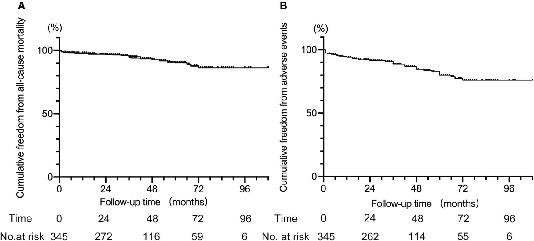 Descriptive statistics were used to describe patient data and outcomes in this cohort. Continuous data are expressed as mean ± SD or median (range), and categorical data are given as the counts (percentage). The Kaplan–Meier analysis was used to establish the rate of freedom from all-cause death and freedom from all adverse events). P < 0.05 was considered statistically significant. Statistical analysis was conducted using GraphPad 7 (GraphPad Software, Inc., San Diego, CA, United States).