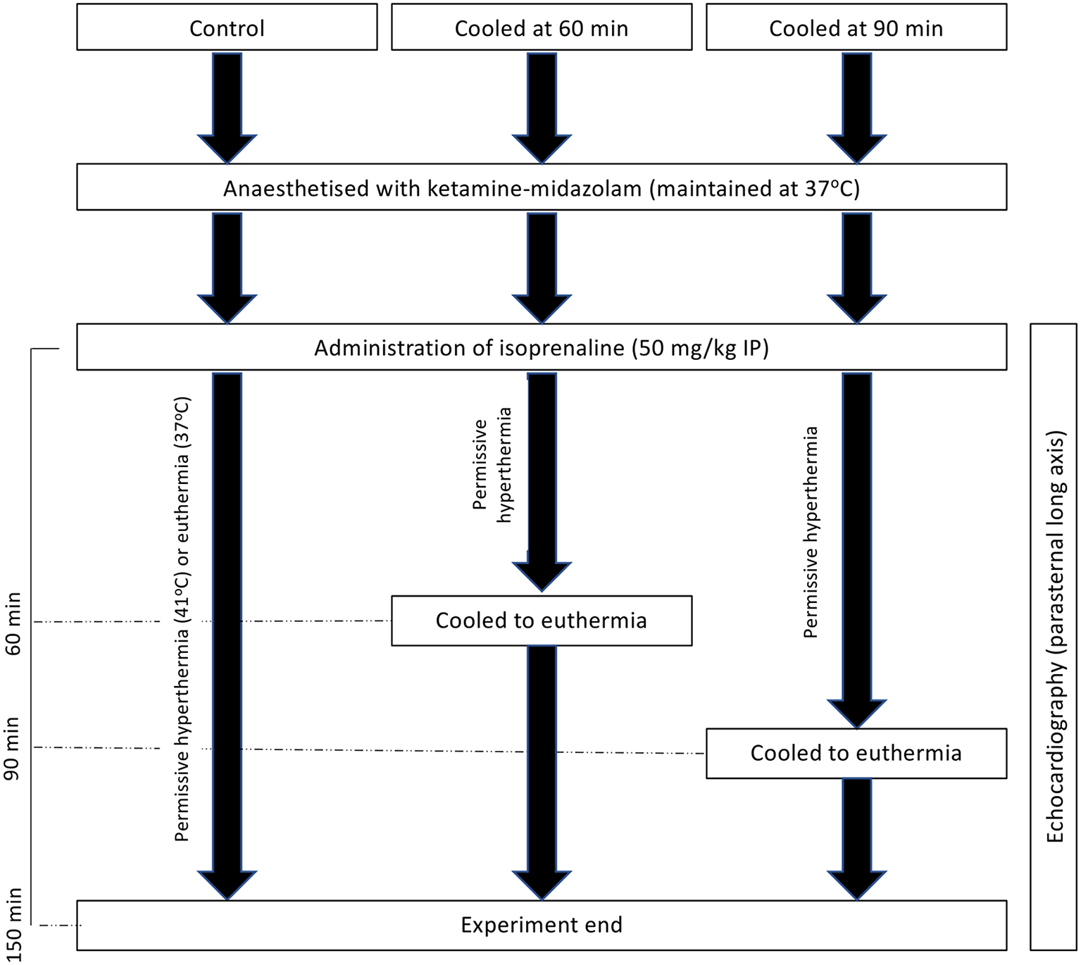 Figure 1. Experimental schematic of hyperthermic experiments with and without cooling to 150 min post-isoprenaline administration.
