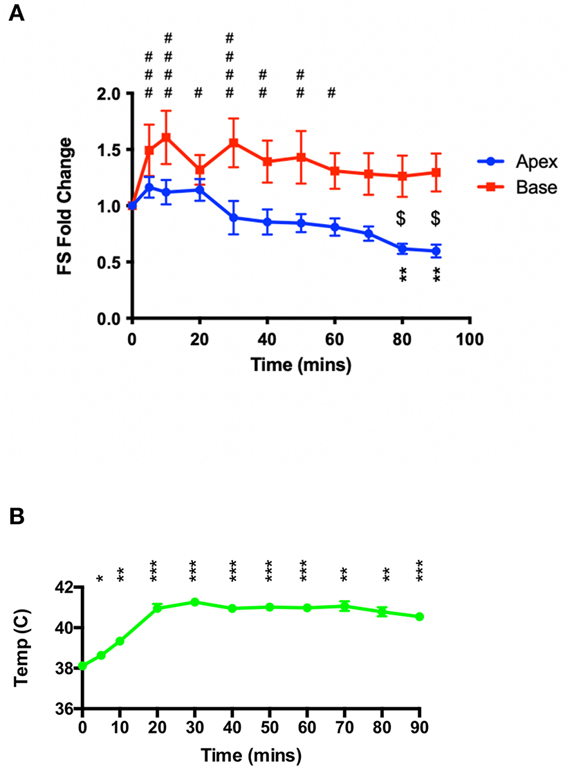 Figure 3. High-dose isoproterenol (50 mg.kg−1) administration under hyperthermic conditions (~41°C) results in apical-hypocontractility. (A) 50 mg.kg−1 isoprenaline under ketamine-midazolam anesthesia resulted a significant positive inotropic response was seen in the basal myocardial segment for the first 60 min, whereas the apical myocardial segment showed a significant negative inotropic response at 80 and 90 min post-isoprenaline. **P < 0.01 apex vs. baseline; $P < 0.05 apex vs. base; #P < 0.05, ##P < 0.01, ###P < 0.001, ####P < 0.0001 base vs. baseline, two-way repeated measures ANOVA (n = 6). (B) Sustained heating of the animal maintains a significant elevated body temperature post-isoproterenol. *P < 0.05, **P < 0.01, ***P < 0.001 relative to baseline temperature, one-way ANOVA (n = 6 animals).