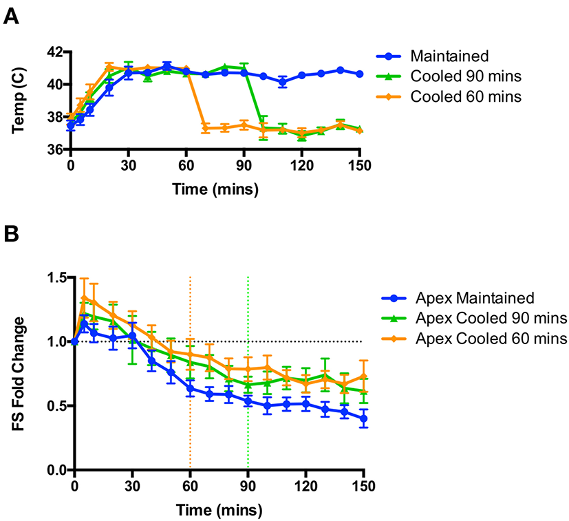 As hyperthermia was essential to the induction of apical dysfunction, we hypothesized that restoration of a euthermic body temperature would either attenuate or reverse the dysfunction. In a separate set of studies shown in Figure 4, rats were randomized prior to study either to be cooled at 60 or 90 min post-isoproterenol, or be maintained at 41°C; all animals were studied to 150 min post-isoproterenol regardless of group. Through the application of cooling packs we were able to rapidly reduce the body temperature back into the euthermic range (Figure 4A). We found no significant change in apical hypocontractility in either cooled group compared to the maintained group; apical hypocontractility was sustained in all three groups (Figure 4B).