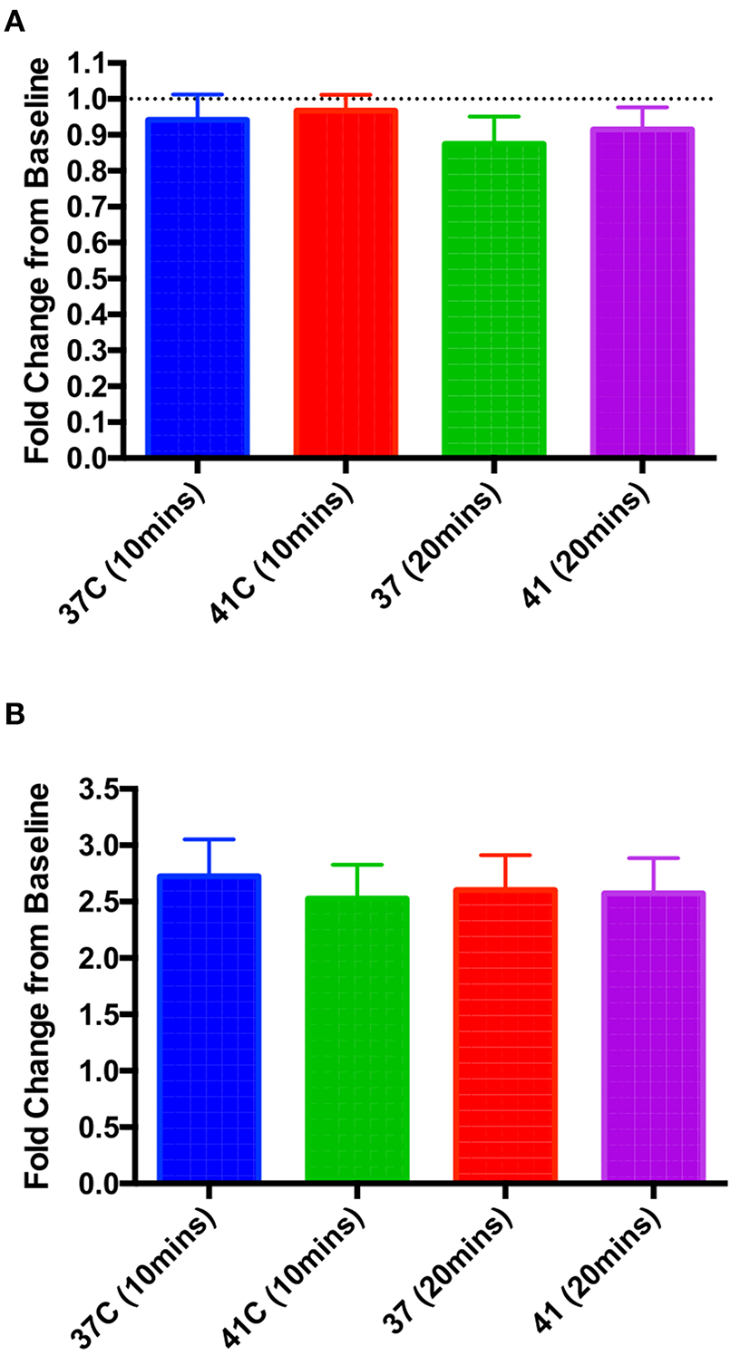 Isolated rat left ventricular cardiomyocytes were perfused with Krebs-Henseleit (KH) solution at 37°C for 10 min, after which a measurement of cellular shortening was taken and perfusion temperature increased to either 41°C or maintained at 37°C (control). No significant changes in contractility were seen with this increase in temperature (Figure 5A). In a separate set of experiments, isolated cardiomyocytes were perfused with KH at either 37°C or 41°C, and after a 10 min stabilization period, a baseline measurement of cellular shortening was taken and isoproterenol (10−6 M) was added to the perfusate. Measurements were taken at 10 and 20 min post-isoproterenol addition, and no significant differences were seen between the two temperature groups at either time point (Figure 5B).
