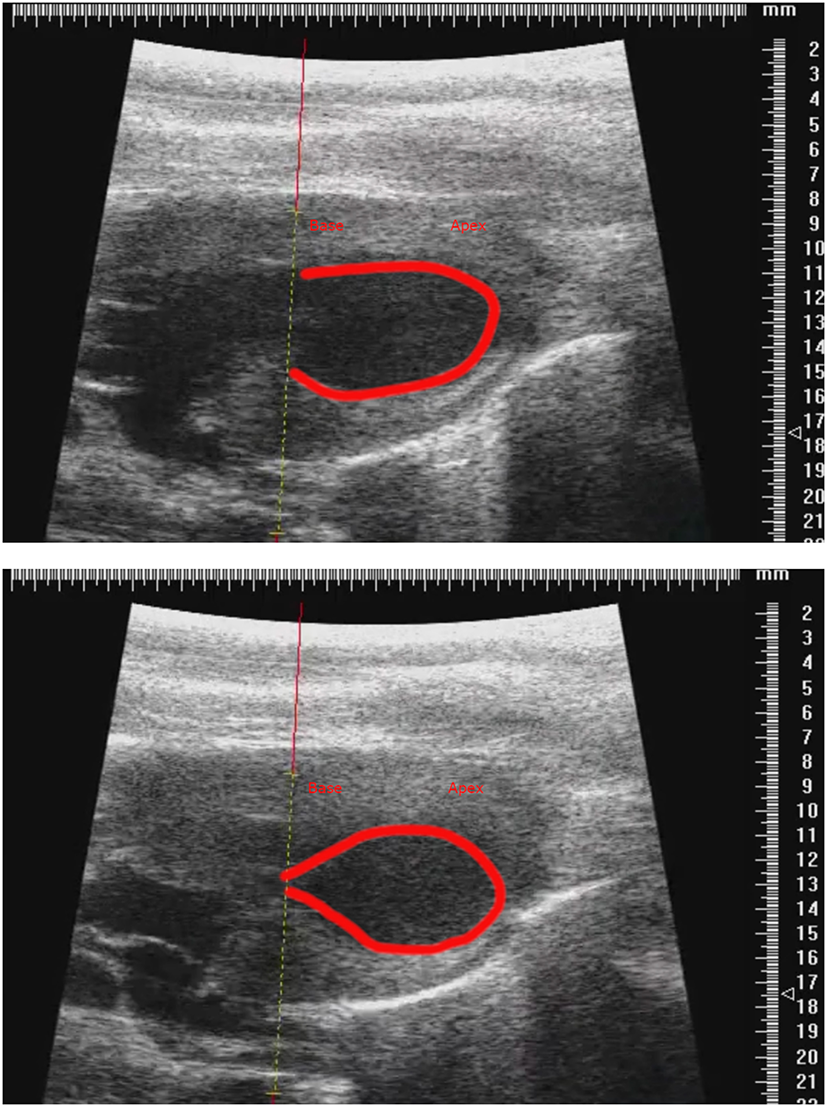 Figure 6. Representative parasternal long axis B-mode images of end-diastole (top) and end-systole (bottom) after induction of TTS-like contractility (base: left; apex: right), with trace (red line) drawn around endocardial border. Scale in mm.