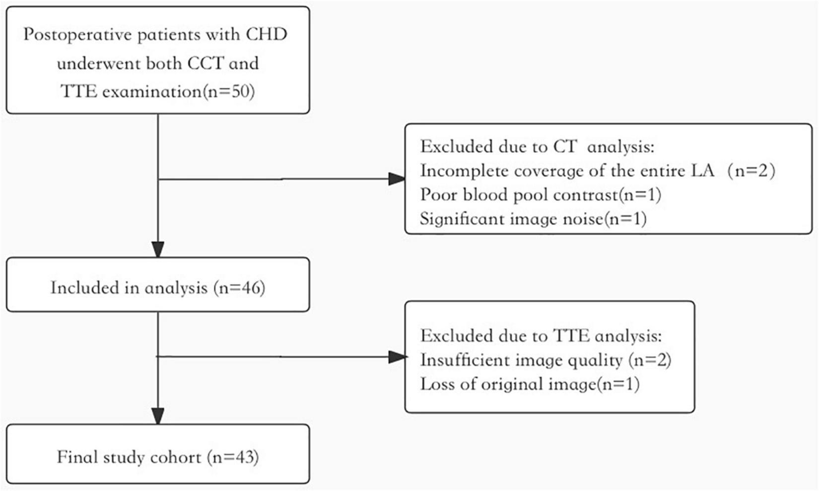 This was a prospective cross-sectional and single-center study, which consisted of 50 consecutive postoperative patients with CHD with sinus rhythm. For inclusion, patients who underwent clinically indicated follow-up CCT examination from February 2021 to June 2021 were included and transthoracic Doppler echocardiography was performed on the same day. The exclusion criteria were (1) CCT image quality was inadequate for analysis: incomplete coverage of the entire LA (n = 2), poor blood pool contrast (n = 1), and significant image noise (n = 1). (2) Insufficient image quality (n = 2) and loss of raw data (n = 1). At last, the final study cohort consisted of 43 patients (Figure 1 shows the flowchart of the study population). For this cohort, all children were kept at rest and quiet during the CCT and TTE examinations. Young children < 6 years of age and children who did not cooperate during the examination were sedated with oral chloral hydrate (50 mg/kg) and intravenous pentobarbital (3–5 mg/kg) if necessary. The study was implemented according to the standards of the Declaration of Helsinki and the study was approved by the Shanghai Children’s Medical Center. The patients or patients’ guardians provided written informed consent to participate in this study.
