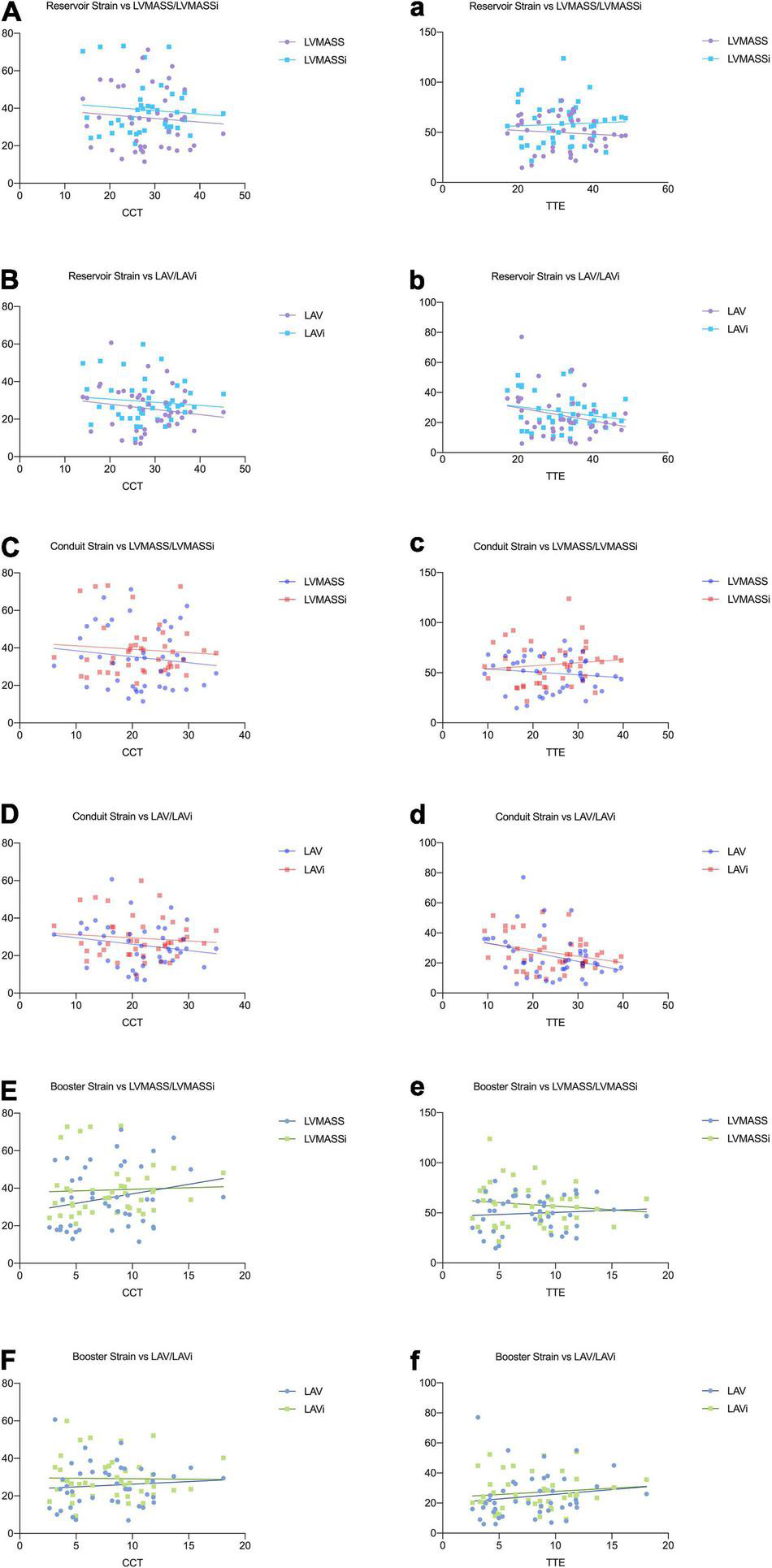 Correlation analysis showed that reservoir and conduit strain were negatively correlated to LAV/LAVi and LVMASS/LVMASSi in both CCT and TTE. The booster strain was positively correlated to LAV/LAVi and LVMASS/LVMASSi (Table 5 and Figure 4).