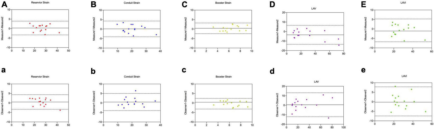 Figure 5. Intra-observer (A–E) and inter-observer agreement (a–e) for LA reservoir strain, conduit strain, booster strain, LAV, and LAVi measurements by CCT in 15 random studies.