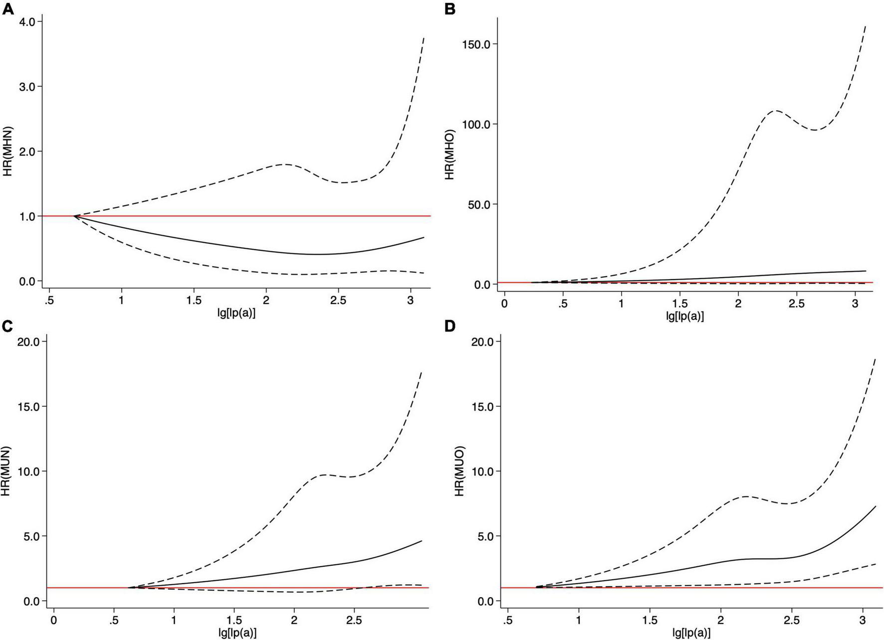 During a median of 7.5 years’ follow-up, 540 (10.6%) CVEs occurred. MUN and MUO populations had more severe coronary stenosis than MHN ones, while no significant difference in the Gensini score (GS) was observed between MHN and MHO. Patients with MUN and MUO presented a higher risk of CVEs than patients with MHN (hazard ratio [HR]: 1.414, 95% CI: 1.024–1.953–1.556 and HR: 1.747, 95% CI: 1.295–1.363, p < 0.05). In subgroup analysis, restricted cubic spline models showed that there was no association between Lp(a) and CVEs in patients in MHN and MHO, while the MUN and MUO groups presented increasing associations between Lp(a) and CVEs and such association was stronger in the MUO group. In Cox regression analysis, Lp(a) >50 mg/dl was associated with a 2.032- and 2.206-fold higher risk of subsequent CVEs in the MUO and MUN subgroups, respectively.