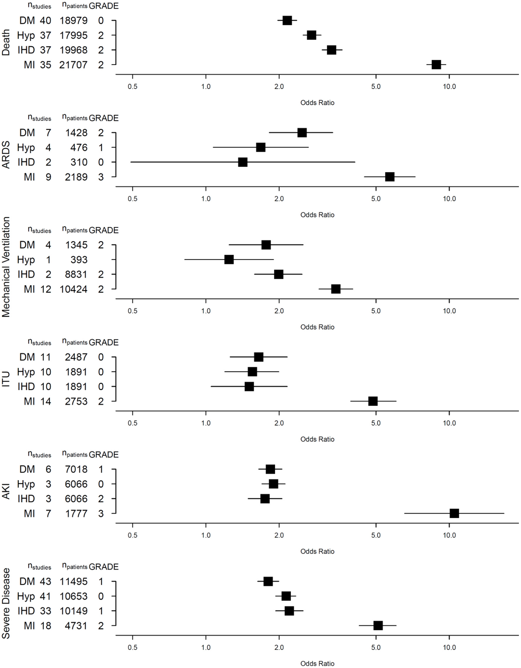 We included studies published between 1st December 2019 and 16th July 2020 with extractable data on patients ≥18 years of age with suspected or confirmed SARS-CoV-2 infection. Odds ratios (OR) for the association between DM, HTN, IHD and myocardial injury with each of six COVID-19 outcomes were measured.