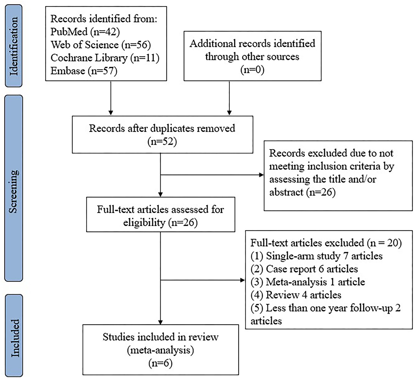A clinical study was eligible if it met the following inclusion criteria: (1) randomized controlled trials and cohort and observational studies; (2) studies with a follow-up of one-year or longer; (3) studies comparing the outcomes of VOM-ABL and ablation alone for AF patients, including long-term freedom from AF/AT, successful MI block, pericardial effusion, stroke/transient ischemic attack (TIA), and all-cause death; (4) studies with full-text availability published in English in peer-reviewed journals; (5) only the studies containing the most data were included for multiple publications of the same trial or cohort. Meanwhile, single-arm studies, studies without original data, review articles, case reports, letters, editorials, and animal studies were excluded. Two independent reviewers (F. Li and J.-Y. Sun) searched and reviewed the titles, abstracts, and full texts to determine the eligible study. Any disagreements about eligibility were resolved by consulting a third reviewer (R.-X. Wang).