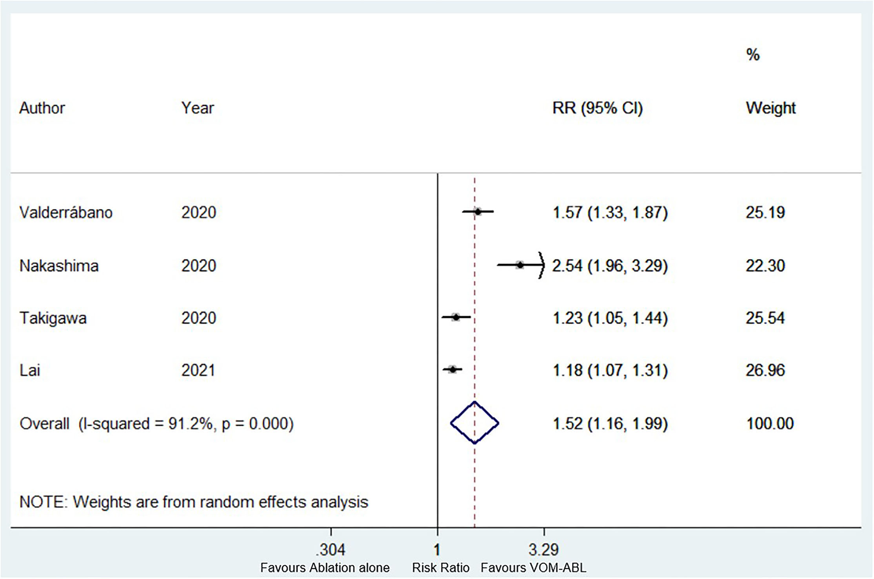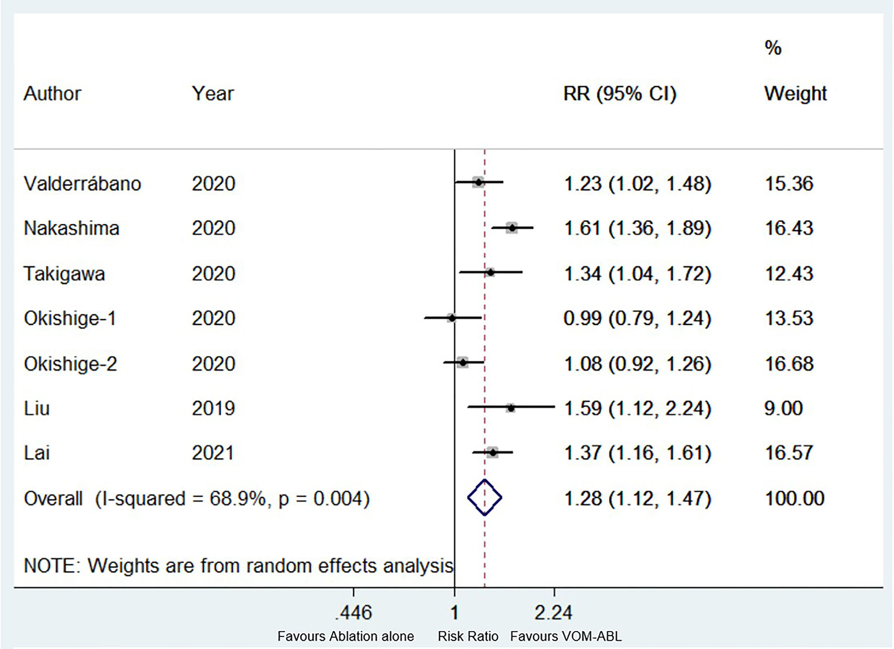 PubMed, Cochrane Library, Web of Science, and Embase were searched up to 1st September 2021. Studies comparing the long-term (one-year or longer) outcomes between VOM-ABL and ablation alone were included. Subgroup analysis identified potential determinants for VOM-ABL procedure.