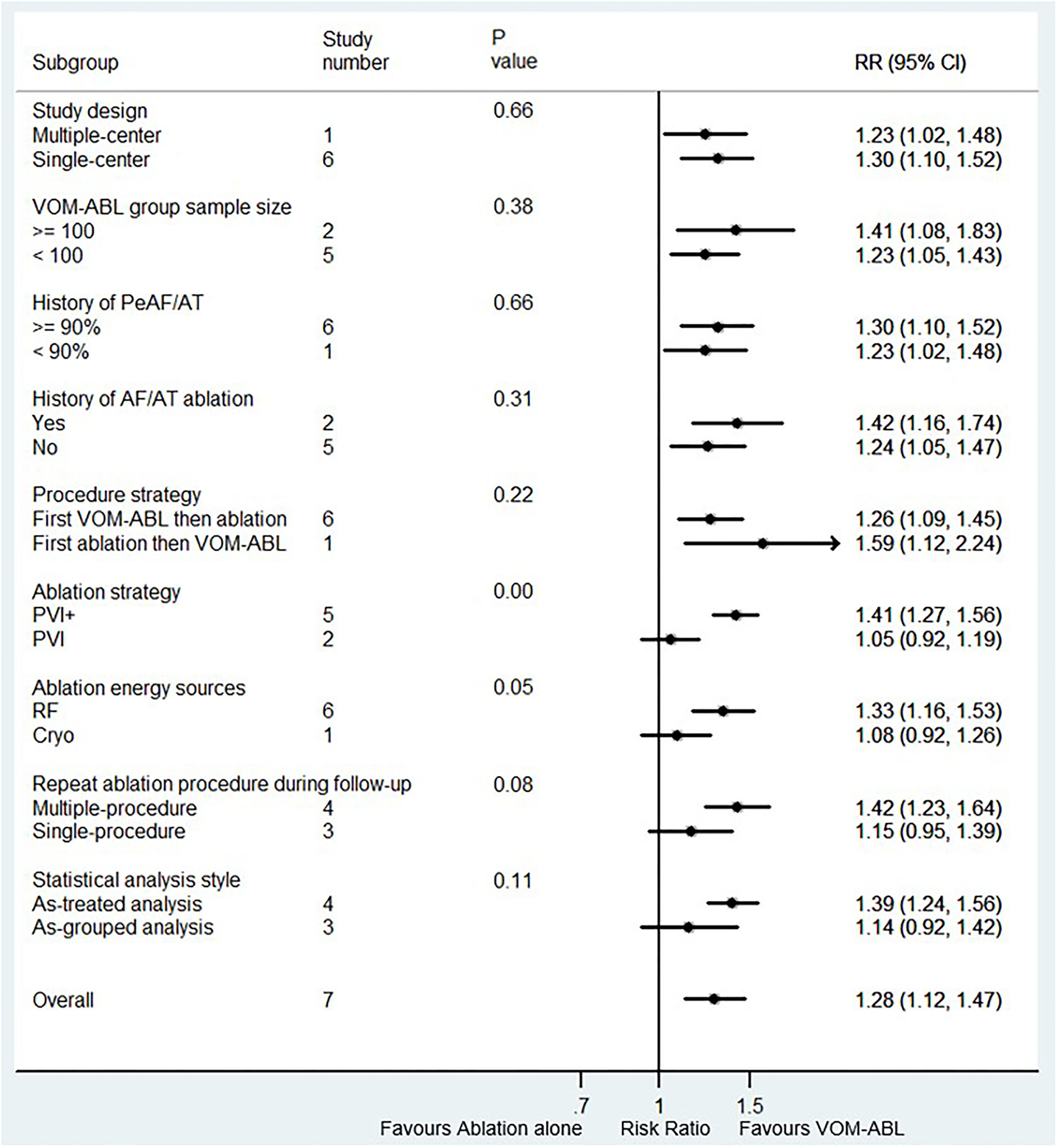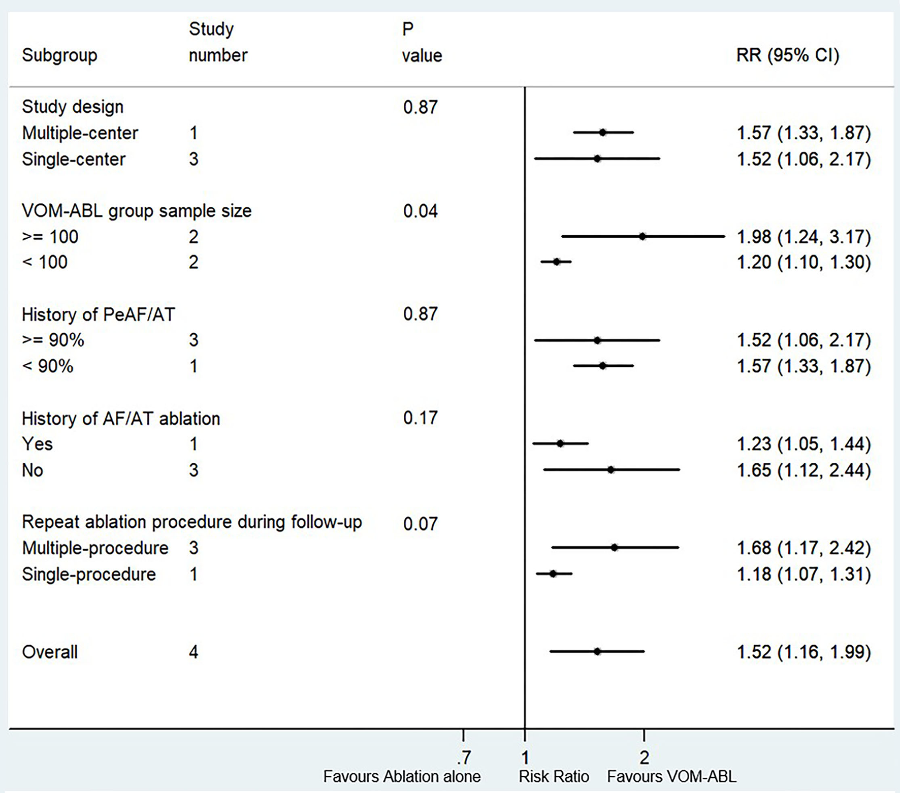 Compared with ablation alone, VOM-ABL was associated with a significantly higher rate of long-term freedom from AF/AT (risk ratio [RR], 1.28; 95% confidence interval [CI], 1.12–1.47; p = 0.00) and successful mitral isthmus (MI) block (RR, 1.52; 95% CI, 1.16–1.99; p = 0.00), whereas, there was no significant difference in pericardial effusion, stroke/transient ischemic attack (TIA), and all-cause death. Subgroup analysis identified two significant treatment-covariate interactions: one was ablation strategy subgroup (pulmonary vein isolation plus linear and/or substrate ablation [PVI+]; RR, 1.41; 95% CI, 1.27–1.56 vs. PVI; RR, 1.05; 95% CI, 0.92–1.19, p = 0.00 for interaction) for freedom from AF/AT, while the other was VOM-ABL group sample size subgroup (≥ 100; RR, 1.98; 95% CI, 1.24–3.17 vs. <100; RR, 1.20; 95% CI, 1.10–1.30, p = 0.04 for interaction) for MI block.