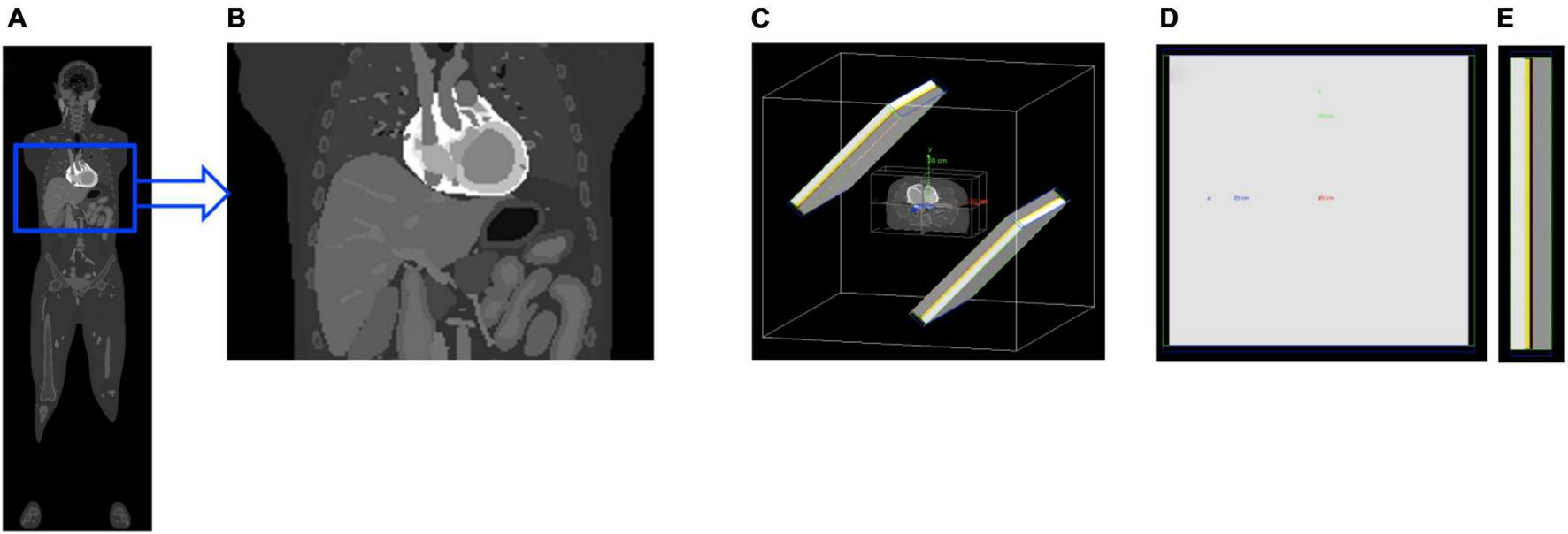 The 4D XCAT whole-body phantom (A) was cropped and simplified to model a cardiac torso (B). The torso was then imported to a SPECT system geometry (C) with collimator (gray), detector crystal (yellow), back-compartment (white) and lead-shields (blue and green). Also shown are the rear (D) and side (E) view of the detector.