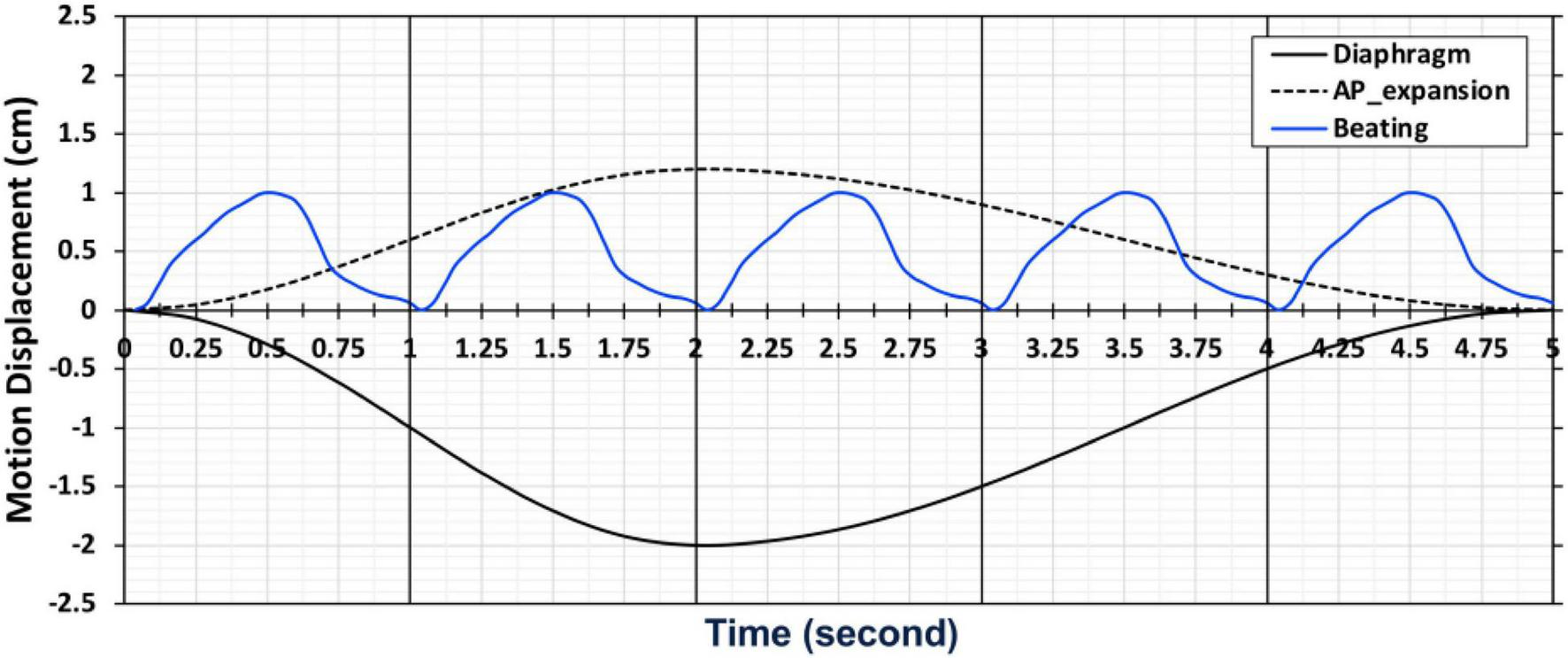 A chart depicting the motion of cardiac and respiratory series for 40 phantoms with 5 cardiac and 1 respiratory cycle from end-inhalation to exhalation.