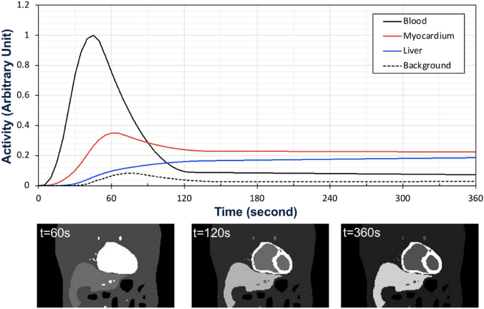 Once the phantom was specified, the activities of different organ tissues such as myocardium, blood, liver and background were simulated using typical time-activity-curves (TACs) of patients in our previously completed dynamic cardiac SPECT studies with Tc-99m tetrofosmin (12). The activity in each tissue in the series of 40 phantoms was changed as a function of time according to the activities in the TACs (Figure 3). Once the activity in the phantom was assigned with a given TAC, the camera was rotated continuously around the phantom acquiring the data at each 0.125 s interval. The rotation speed of the detector heads was adjusted in such a way that the gamma camera acquired the projection data per 0.50 angle increment as the activity in the phantom changes continuously. Therefore, the time per rotation (period) of each camera head was 90 s, which is a typical rotation speed of the GE Infinia Hawkeye SPECT camera. In our simulation, there was a total of 4 rotations per detector head corresponding to the total acquisition time of 6 min.