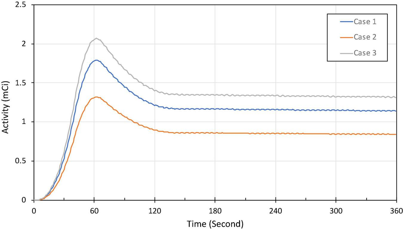 To test and validate the reconstruction algorithm, we simulated 5 different cases by modeling the TACs with different target (myocardium) to background activity ratios (TBRs) (Table 2). In all cases, we kept the total activity fixed with approximately 25 mCi at the maximum activity point in the injected dose and varied the ratios of activity of the TBR at 5, 8 and 10 at the end of the acquisition time (Case 1–3). In our simulation we considered Case 1 (TBR = 8) as the reference case for this study. Case 2 with TBR = 5 and Case 3 with TBR = 10 were considered as upper and lower bound of TBR around this reference. We have not explicitly incorporated additional noise in the simulation. However, the lower TBR corresponded to higher background activities which involved higher noise levels. Figure 4 shows the myocardial activities as a function of time for these 3 cases and Figure 5 shows the coronal views of the phantom at the end of the acquisition time (t = 360 s) corresponding to these cases.
