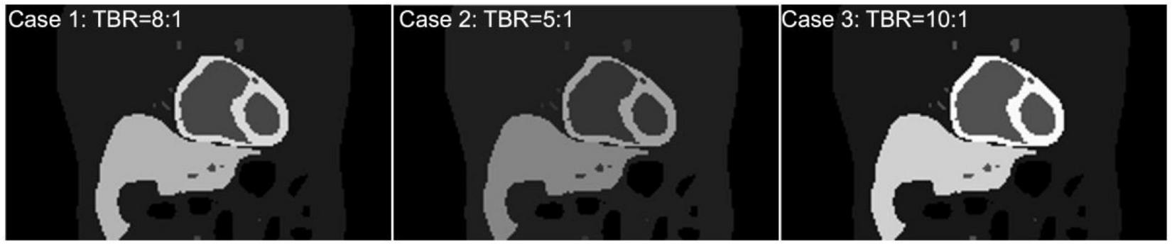 Approximate activity distribution in the myocardium for three different TBRs: 8 (Case 1), 5 (Case 2), and 10 (Case 3).